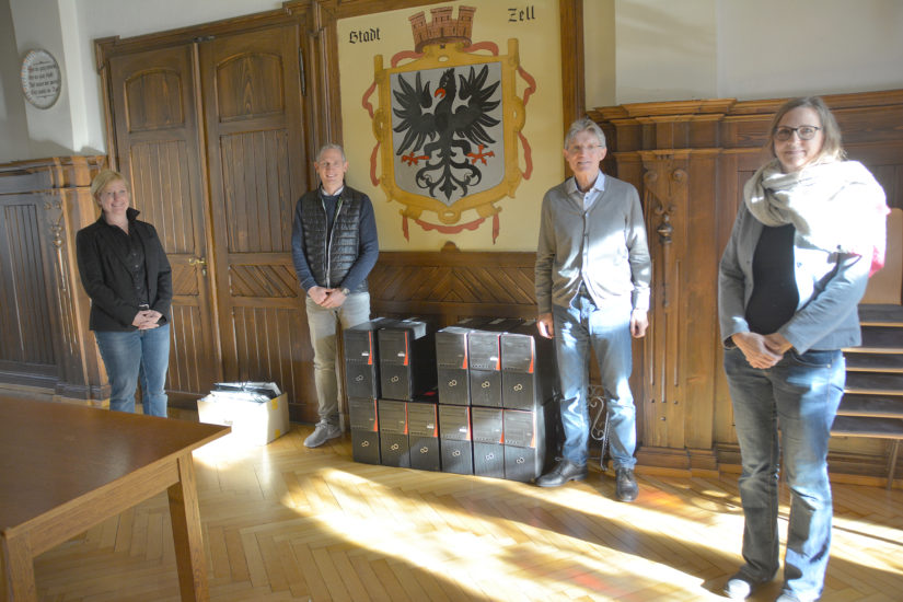 Übergabe von zwölf Rechnern im Rathaussaal (von links): Rektorin Anne-Catrin Medel und Lehrer Jürgen Armbruster danken Hauptamtsleiter Ludwig Börsig und Mitarbeiterin Mirijana Kresina von der Stadt Zell für die wertvolle Unterstützung. Foto: Hanspeter Schwendemann