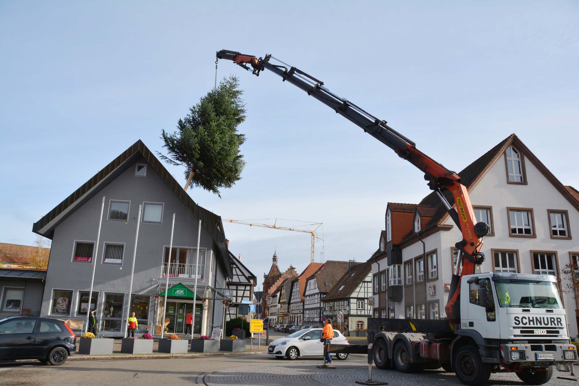 »Die Vorbereitungen laufen in vollem Umfang, als gäbe es kein Corona«, stellt Betriebshofleiter Matthias Fritsch fest. Die großen Bäume, verteilt über das ganze Stadtgebiet, werden wie in den Vorjahren aufgestellt und mit Lichtern geschmückt. Auf dem Platz bei Volksbank und Narrenbrunnen wurde vom Betriebshof in den letzten Tagen eine neue Bodenhülse installiert, so dass auch dort künftig ein großer Weihnachtsbaum aufgestellt werden kann.
