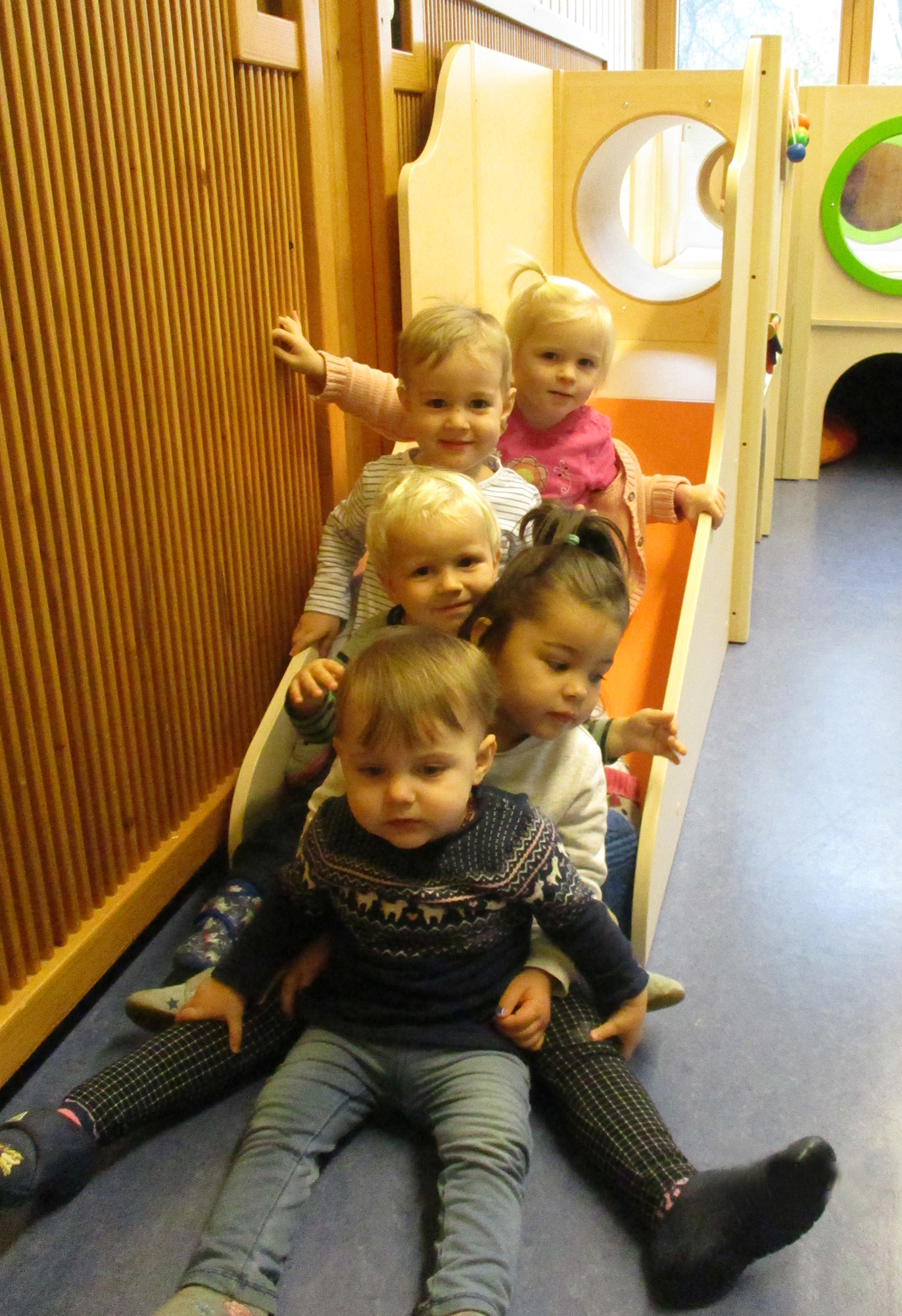 An dieser langen Liste zeigt sich die große Vielseitigkeit des Podests. Es gibt einen Wellengang, einen Tunnel, eine Rutsche, Höhlen, ein Spiegelelement und Spielelemente an der Außenwand sowie ein Bullauge. Und endlich haben jetzt alle die Möglichkeit, selbstständig zum Fenster rauszuschauen und das Geschehen auf dem Hof oder die Tiere im Garten zu beobachten und zu winken. Es wird auch gerne »Kuckuck da« durch das Bullauge gespielt. Den eigenen Körper und andere komplett in einem Spiegelbild zu sehen, den Überblick über den Gruppenraum zu haben – all das sind wichtige Erfahrungen für die kleinen Kinder.