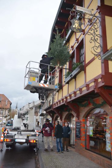 Nun hat Vorsitzender Paul Lehmann vom Handels- und Gewerbeverein die Organisation übernommen. Gemeinsam mit weiteren Helfern wird er am kommenden Donnerstag, 26. November, die Mitgliedsfirmen dabei unterstützen, die Tannenbäumchen an den Häusern zu installieren. Zum Einsatz kommt auch wieder eine Hebebühne, mit deren Hilfe die ganze Arbeit deutlich erleichtert wird. Nach den intensiven Arbeiten des Vorjahres sollte es somit wieder gelingen, dass das Tannenbaumstädtle in seiner ganze Pracht erstrahlt.