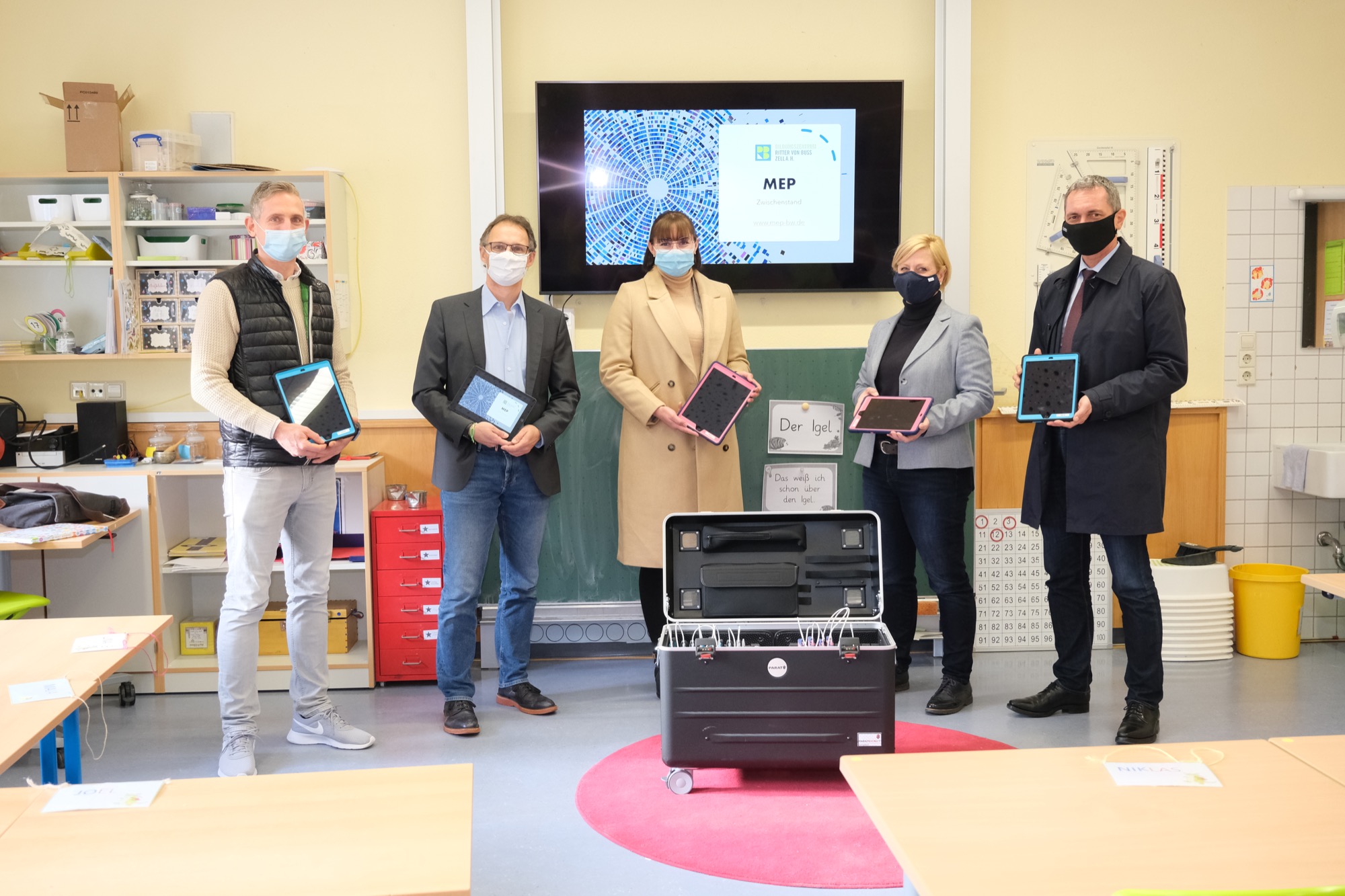 Lehrer Jürgen Armbruster, Grundschulleiter Wolfgang Scharer, die stellvertretende Hauptamtsleiterin Saskia Oschwald, Rektorin Anne-Catrin Medel und Bürgermeister Günter Pfundstein zogen am Freitag Zwischenbilanz in Sachen Medienentwicklungsplan der Zeller Grundschule. Foto: Susanne Vollrath