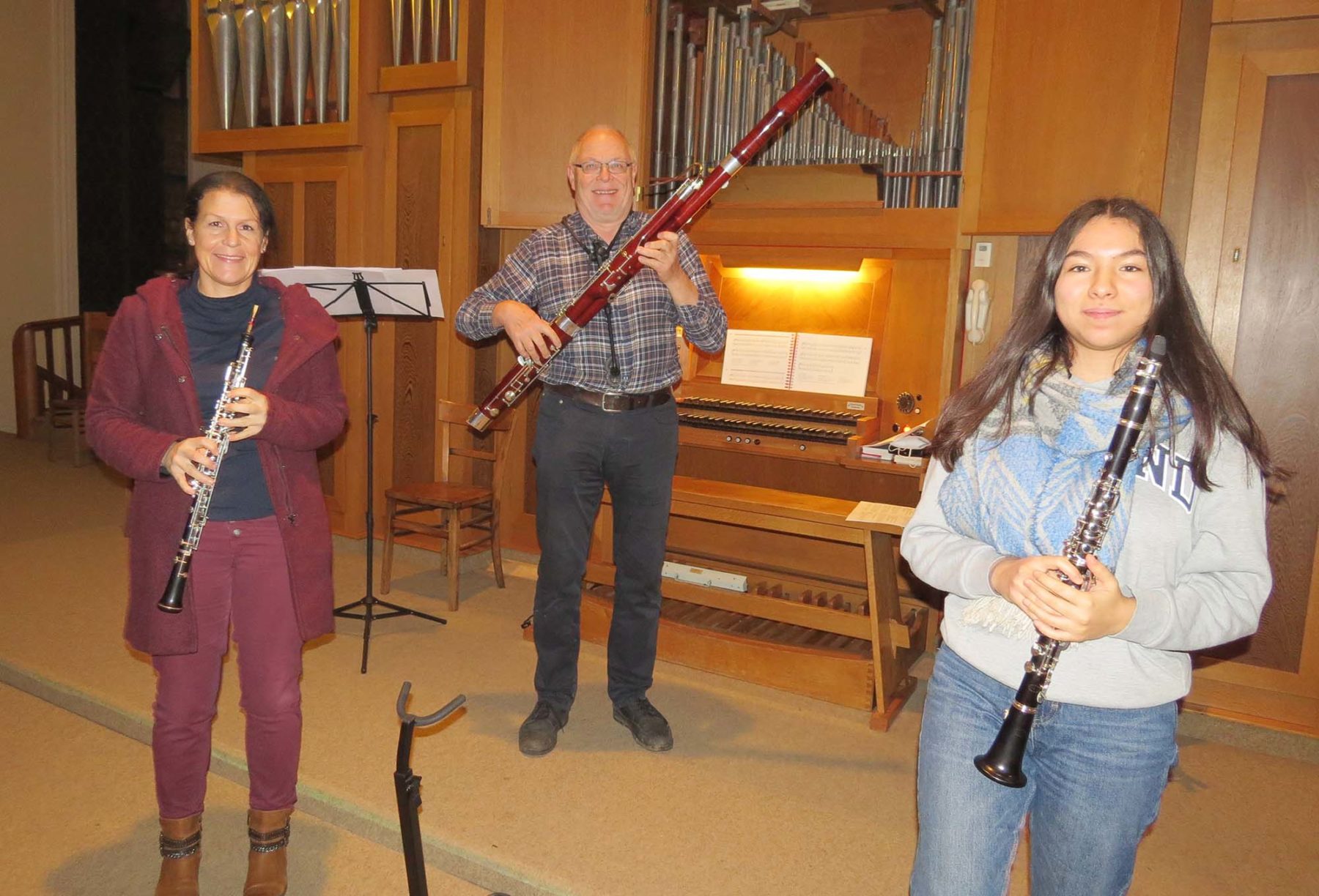 Danach erklang das beliebte Weihnachtslied »Stille Nacht, heilige Nacht« von der Orgelempore mit dem Gesang von Simone Ette und ihren Töchtern Amelie und Annabell, begleitet von Wolfram Dreher an der Orgel. Hell erklangen die schönen Stimmen der Chorsängerinnen durch der Kirchenraum. Das Lied »Es ist ein Ros entsprungen« wurde instrumental vom Bläsertrio gespielt – Wolfram Dreher am Fagott, Sonja Müller an der Oboe und Carina Carbone an der Klarinette.
