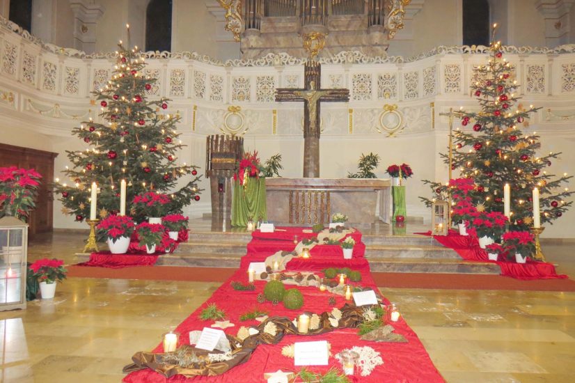 Die Feier um 17.00 Uhr fand als Wortgottesdienst ohne einen Priester statt. Der Liturgiekreis unter Leitung von Brigitte Metzler feierte den Hl. Abend als Fest der Geburt Jesu mit meditativen Texten und ausführlich gestalteten Fürbitten. Brigitte Metzler begrüßte die Besucher: »Ja, es ist Weihnachten geworden. In diesem Jahr ist alles anders: Wir feiern nur mit einer kleinen Anzahl Besucher. Und wir dürfen leider keine Weihnachtslieder singen.«