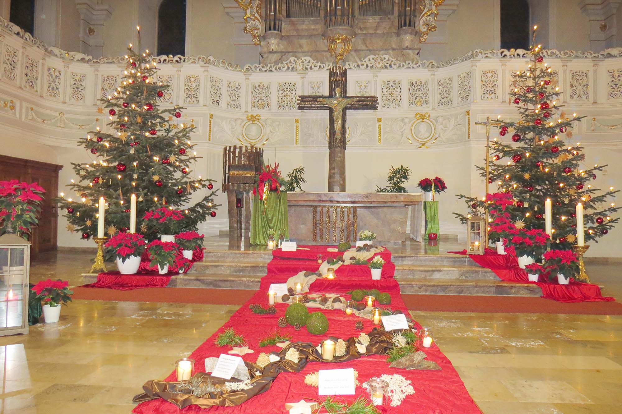 Im Evangelium wurde dann von den Hirten berichtet, denen der Engel des Herrn verkündet, dass der Retter gekommen ist und sie ihn in einem Stall finden werden. Daraufhin gingen die Lichter an den großen Weihnachtsbäumen im Altarraum an. Die Sängerinnen zeigten in dem Lied »Engel von den Feldern singen«, wie schön das Weihnachtsevangelium auch musikalisch ausdrucksvoll gestaltet werden kann. Am Ende legte die Vortragende Brigitte Metzler das Evangeliar an der Krippe ab, begleitet von den Ministranten mit Weihrauch.