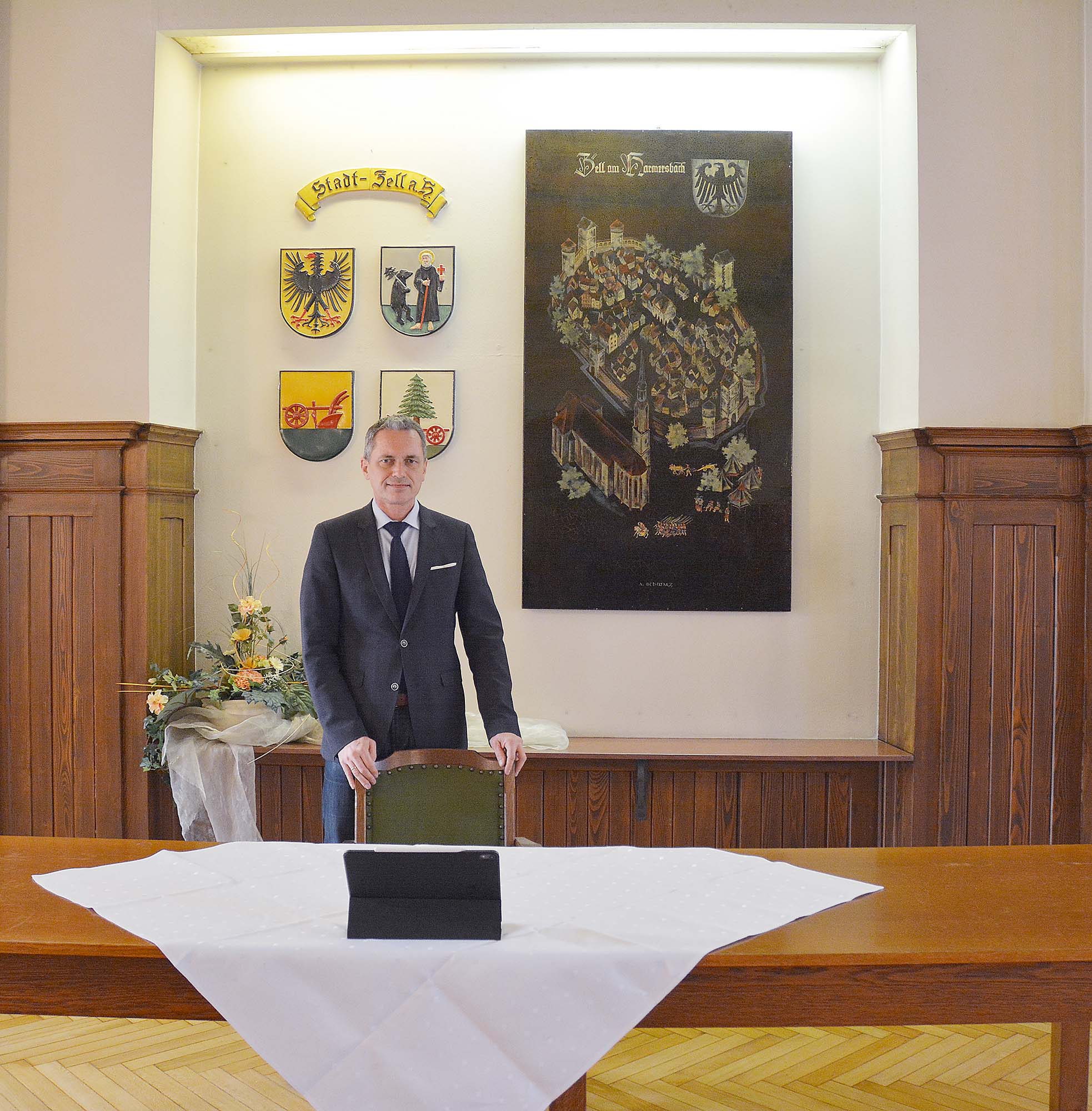 Seine Ansprache, die wir nachfolgend im Wortlaut wiedergeben, hat Bürgermeister Günter Pfundstein im Rathaussaal gehalten. Die Wappen der vier Zeller Stadtteile und ein Stich des historischen Stadtkerns bildeten den würdigen Rahmen für die Ansprache. Dennoch bleibt die Hoffnung, dass zum Jahreswechsel 2021/2022 an die langjährige Tradition angeknüpft werden kann.