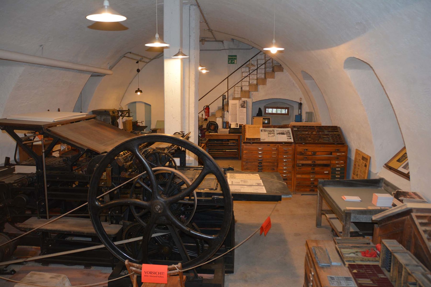 Seit dem Jahr 2007 ist im Gewölbekeller die »Historische Buchdruckerei im Gewölbe« untergebracht. Herzstück der Ausstellung ist die Buchdruckpresse, Baujahr 1903.