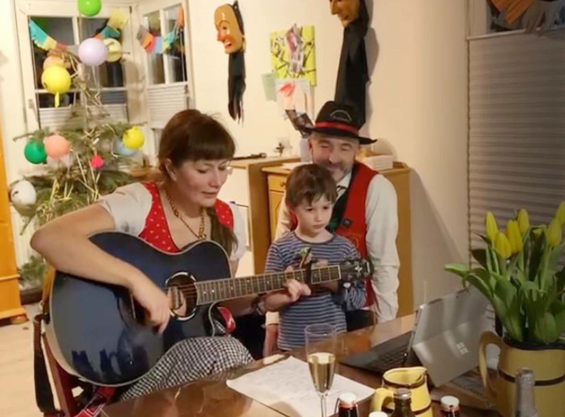 Als erstes Highlight des Abends wurde dann nach einer kurzen Schunkelrunde direkt nach Oberwolfach zu Diana und Vize Alex Bühler geschaltet. Diana spielte live Gitarre und sang dazu das umgedichtete Lied »Lock Down, Covid und Fasend bricht, aber der Neuhauser Obe nicht, Virus Virus geh vorbei, mir sin de Neuhuser treu«. Schon nach diesem Lied war allen Beteiligten klar, dass es ein toller geselliger Abend werden wird.