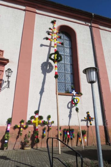 Am Sonntagmorgen konnte aufgrund der Pandemie die beliebte allgemeine Palmweihe auf dem Kirchplatz und die Prozession mit den Kommunionkindern nicht stattfinden. Die große Palme und auch kleinere Palmstöcker wurden draußen an der Kirchenmauer abgestellt. Die farbenfrohen Palmen in Licht der Sonne und gaben ein schönes Bild ab. Kleinere Palmgebinde wurden in der Kirche beim Ambo abgelegt. Das Zeller Gemeindeteam konnte wie schon im letzten Jahr keine große Palme binden, weil die Corona-Bedingungen keine Zusammenkunft erlauben. So schmückt eine kleine Palme den Altarraum.