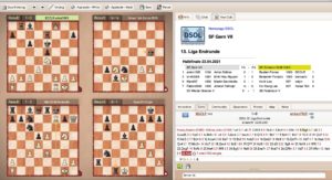 Kurze Zeit später nahm das Schicksal bei Piskadlo seinen Lauf. Der weiße Angriffsläufer seines Gegners drang vernichtend mit Dame und Springer Unterstützung in seine Burg ein. 1,5:1,5. Doch es konnte nichts mehr anbrennen. Zu klar war der Vorteil von Franze an Brett 1. Er hatte schon das Messer am Hals des gegnerischen Königs und der Führer der gegnerischen Steine kapitulierte. 2,5:1,5. Finale! Herzlichen Glückwunsch der Mannschaft, die sich im Turnier stetig gesteigert hat. Viel Erfolg im Endspiel gegen die Paderborner
