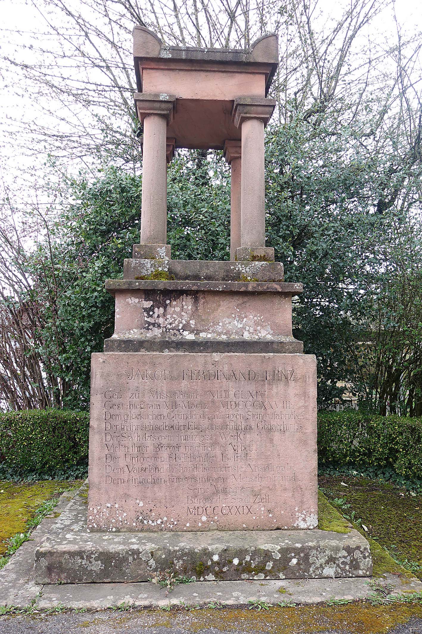 Aus freiwilligen Beiträgen der Lenzianer wurde doch das Denkmal errichtet. Der Platz in dem oberen von vier Säulen getragenen Raum blieb aber leer, weil das Geld nicht mehr reichte. Hier hätte nach dem Plan der Befürworter die Büste von Lenz stehen sollen. Auch der Name von Burger fehlt – leider.