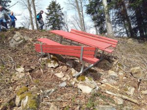 Ein sehr beliebter Weg für Wanderer, Jogger und Mountainbiker ist der Kammweg über den Sommerberg zum Badwald. Im Jahr 2018 wurde dort eine Sitzgruppe aufgebaut, die nun mit Gewalt den Hang hinuntergeworfen wurde. Da kann man sich nur fragen: Wer macht denn so was?