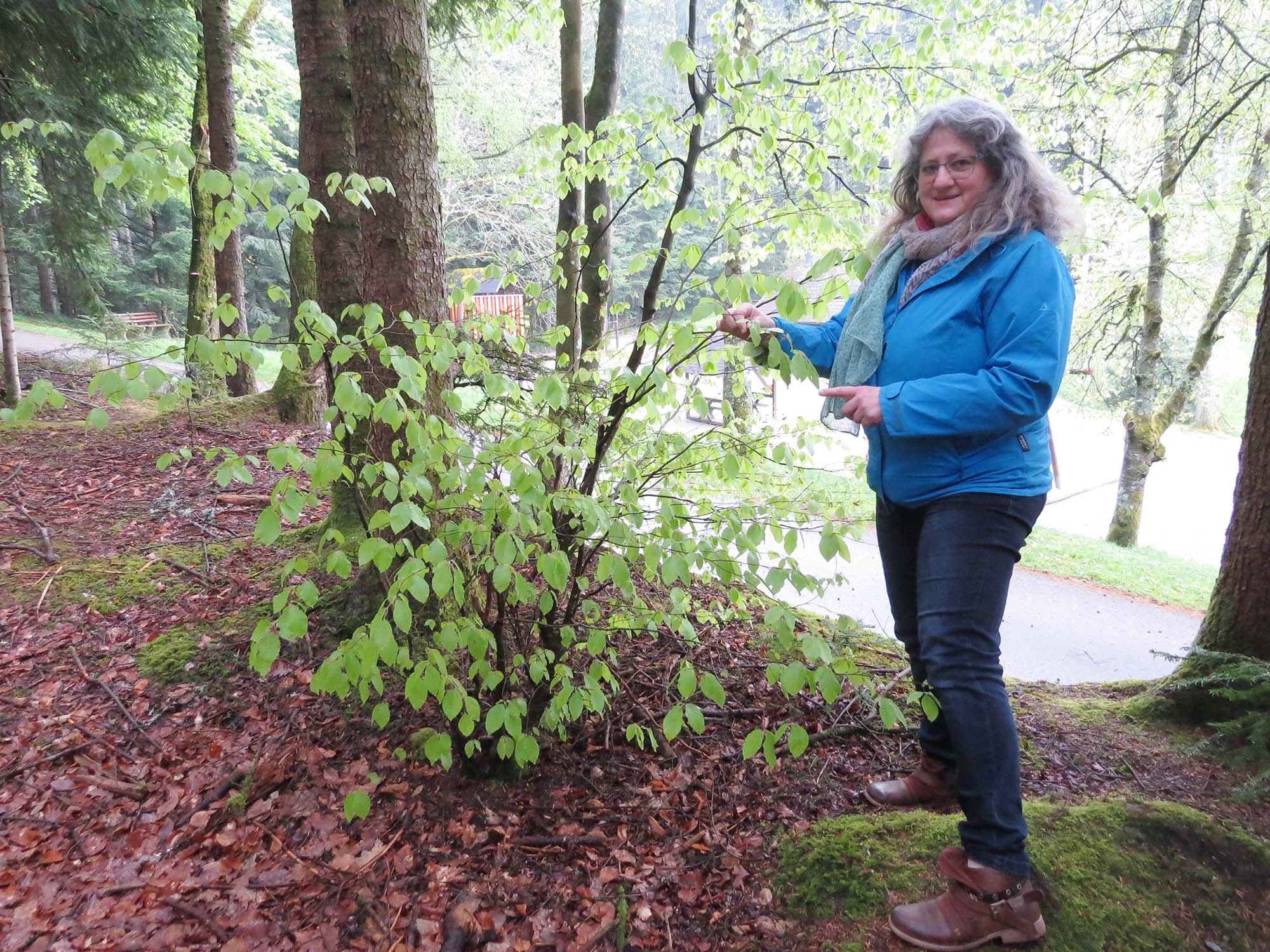 Foto: Gisela AlbrechtBarbara Christ definiert Waldbaden als ein »unterwegs sein« im Wald mit allen Sinnen (sehen, hören, fühlen, riechen, schmecken). Bewusst und achtsam wahrnehmen, was im Wald zu sehen ist bedeutet z. B., den Blick auch nach oben in die Baumwipfel zu lenken, zuschauen, was es am Boden an Krabbeltieren zu entdecken gibt oder welche Bewegungen bei den Pflanzen stattfinden. Fühlen kann man alle Naturmaterialien wie Holz, Baumrinde, Laub oder Pflanzen aller Art. Riechen können feine Nasen die ätherischen Öle, die als Terpene von den Bäumen ausgedünstet werden und das Immunsystem stärken. Zum Schmecken braucht es Experimentierfreude. »Nur in den Mund nehmen, was man kennt«, rät Barbara Christ.
