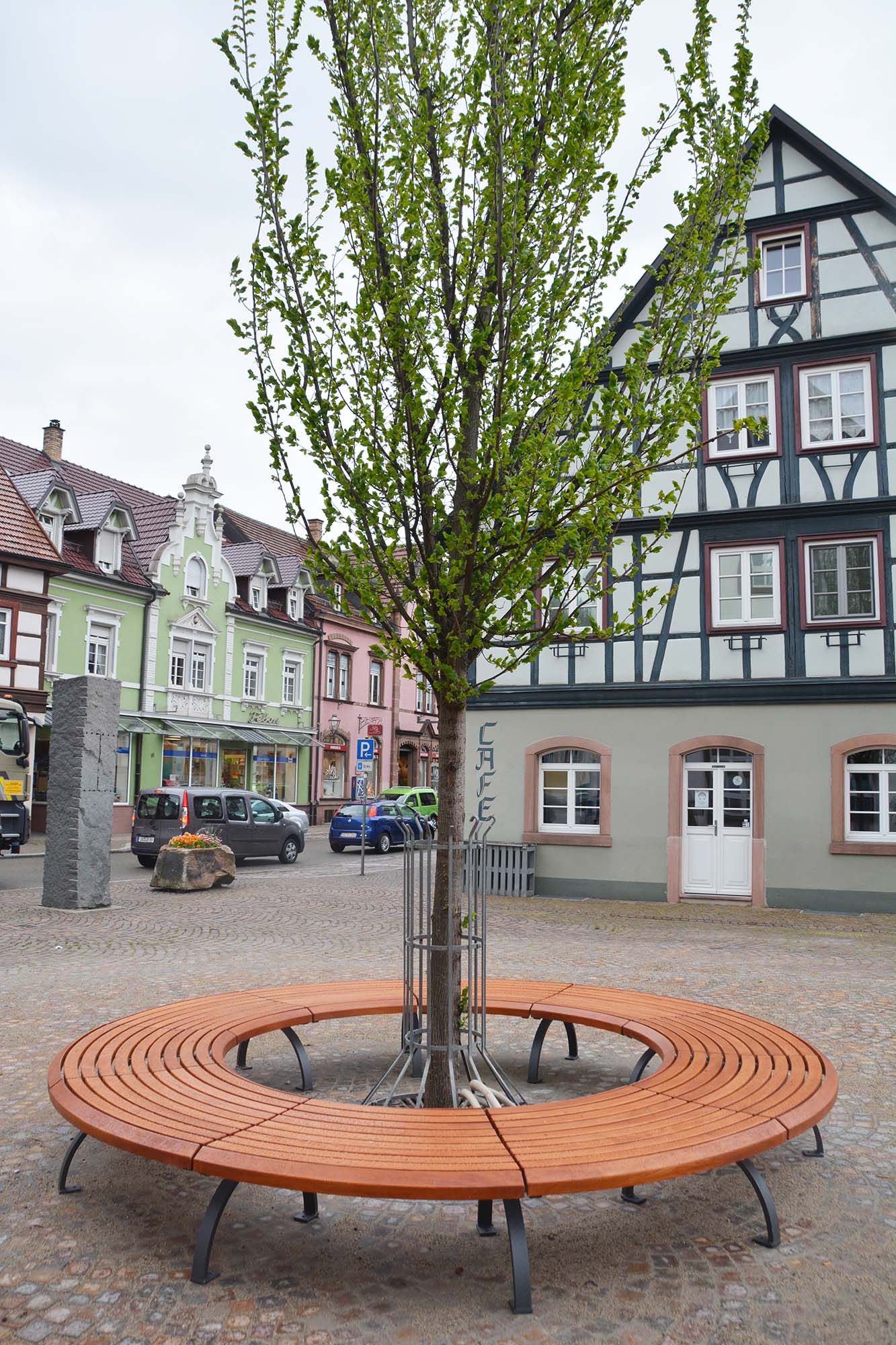Der Platz zwischen Volksbank, Narrenbrunnen und Café Alt Zell hat eine neue, repräsentative Mitte erhalten: Eine Rundbank aus Holz und Stahl umschließt nun die Partnerschafts-Ulme.