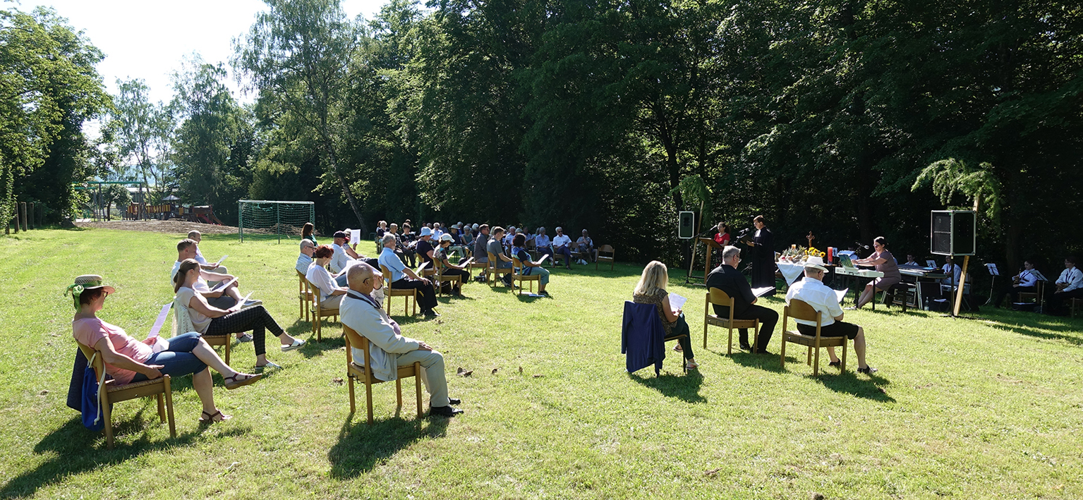 Es war ein sonniger Tag, an dem sich über hundert Gottesdienstbesucher auf einer Wiese oberhalb des Stadtparks versammelten. Sie erfreuten sich am Durchatmen ohne Masken und stimmten weit hörbar ihre Lieder an. Eine Abordnung der Stadtkapelle unter Leitung von Stefan Polap, die Organistin Christiane Bergsträsser und ein Gesangstrio verwandelten den Gottesdienst in ein Open-Air-Konzert mit Klatschen und Zugaberufen.