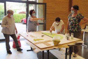 Die konkrete Ausgestaltung beginnt mit der Frage, wie am besten anfangen? Zuerst die Schrift oder zuerst die Umgebung um die Schrift herum? Welche Materialien passen am besten zu dem Kelch? Grundsätzlich gilt es, sich von innen nach außen vor zu arbeiten. Damit die Materialien gut an der Platte haften bleiben, wird diese mit Holzleim sorgfältig Stelle für Stelle eingekleistert. Danach streuen die Frauen die Flächen vorsichtig aus. Dafür benutzen sie manchmal auch Hilfsmittel wie zum Beispiel einen Löffel. Damit kommen sie gut in den Ecken. Auch lange Linien lassen sich so leichter streuen. Die fertige Stelle wird vorsichtig mit einer kleinen Maurerkelle angedrückt. Aufgrund ihrer langjährigen Erfahrung im Blumenteppiche-Legen sind die Frauen mit Werkzeug gut ausgerüstet.