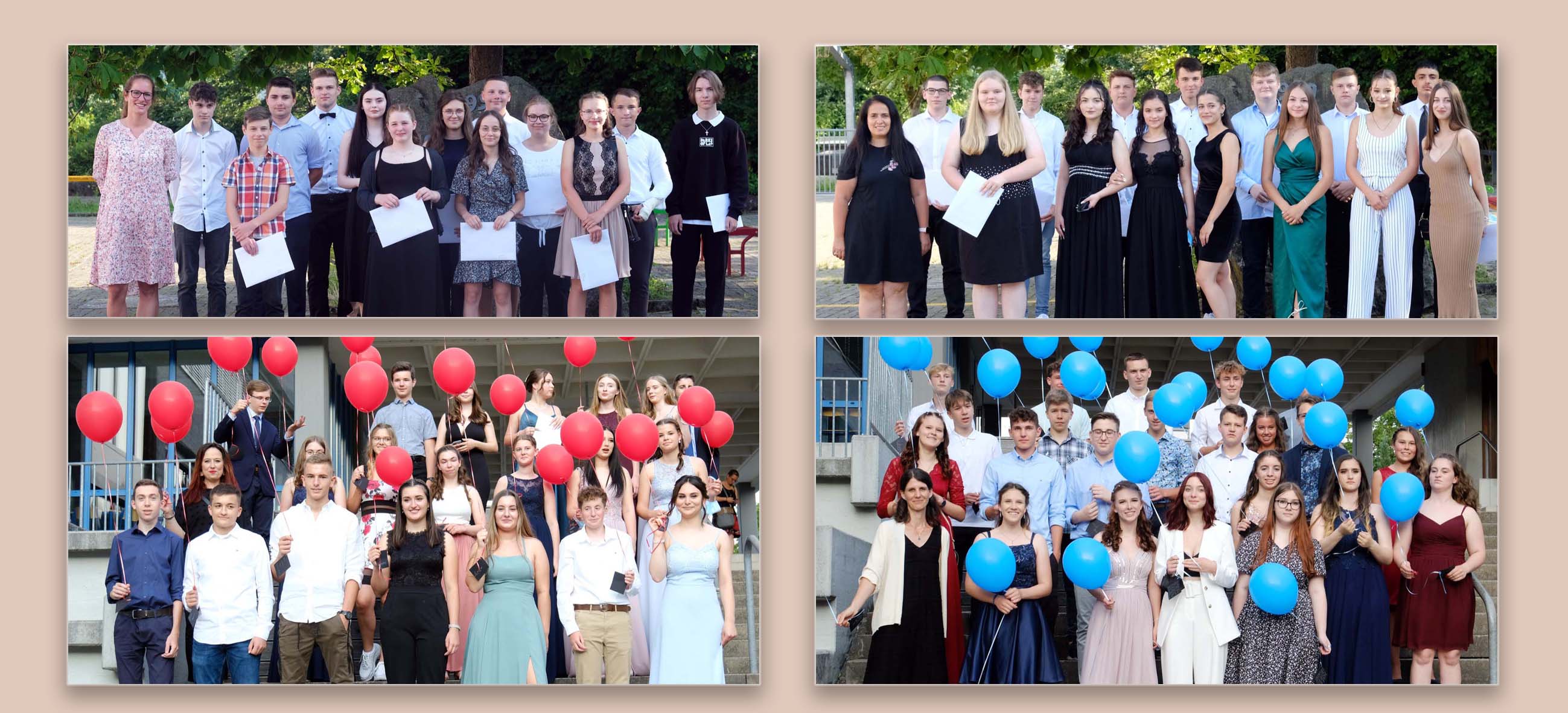 Links oben: Die Schülerinnen und Schüler der W9b des Abschlussjahrgangs 2021 am Bildungszentrum »Ritter von Buß« mit ihrer Klassenlehrerin Katharina Faißt. Rechts oben: Die Schülerinnen und Schüler der W9a des Abschlussjahrgangs 2021 am Bildungszentrum »Ritter von Buß« mit ihrer Klassenlehrerin Ayse Eryilmaz. Links unten: Die Schülerinnen und Schüler der R10a des Abschlussjahrgangs 2021 am Bildungszentrum »Ritter von Buß«. Rechts unten: Die Schülerinnen und Schüler der R10b des Abschlussjahrgangs 2021 am Bildungszentrum »Ritter von Buß«. Foto: Susanne Vollrath