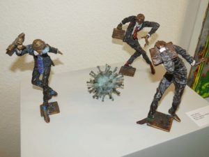 »Mann auf Ei« heisst der Titel einer anderen Skulptur, die einen Mann im Managementanzug zeigt, der ziemlich unsicher versucht, auf einem grossen, goldenen Ei einen sicheren Stand zu finden. Damit soll die Anziehungskraft des Geldes (goldene Kugel) und damit der Luxus verdeutlich werden, der mancher bereit ist, alles andere unterzuordnen.