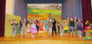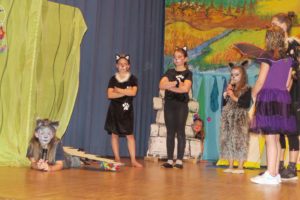 Die Kinder der Altersgruppe 4 bis 9 Jahre zeigten eine lehrreiche Tiergeschichte. Zunächst streiten sich zwei Bärenmädchen, wer von ihnen der stärkere Bär ist. Die beiden Katzen holen die weise Eule, die einen Ausweg weiß: Beide Bären sind gleich stark. Dann kommen zwei Wölfe auf die Bühne, die sehr hung rig, aber auch müde sind und bald einschlafen. Sie werden von Bienen und Schmetterlingen umflogen und dadurch aufgeweckt. Durch ein Gewitter geraten alle Tiere in Aufruhr und nach einem Blitz fällt eine Tanne direkt auf eine Wölfin und begräbt sie unter sich. Verzweifelt ruft sie um Hilfe. Verschiedene Tiere kommen vorbei – doch der Wölfin helfen? Wo diese doch immer gemein zu ihnen war und sie sogar fressen wollte! Das bringt die Wölfin zum Nachdenken: War ich wirklich so böse, dass mir jetzt keiner helfen will? Dann werde ich mich ändern, denkt sie sich. Die lieben Katzen lassen sich schliesslich überreden und räumen den umgestürzten Baum zur Seite, die Wölfin ist wieder frei. Dann will die Wölfin doch tatsächlich die Katzen auffressen… bis die weise Eule mit ihrer Sekretärin, die Fledermaus, einschreitet und der Wölfin das Versprechen abringt, nicht mehr so böse und gemein zu sein. Damit ist die Geschichte zu Ende und alle Akteure zeigen einen fröhlichen Tanz.