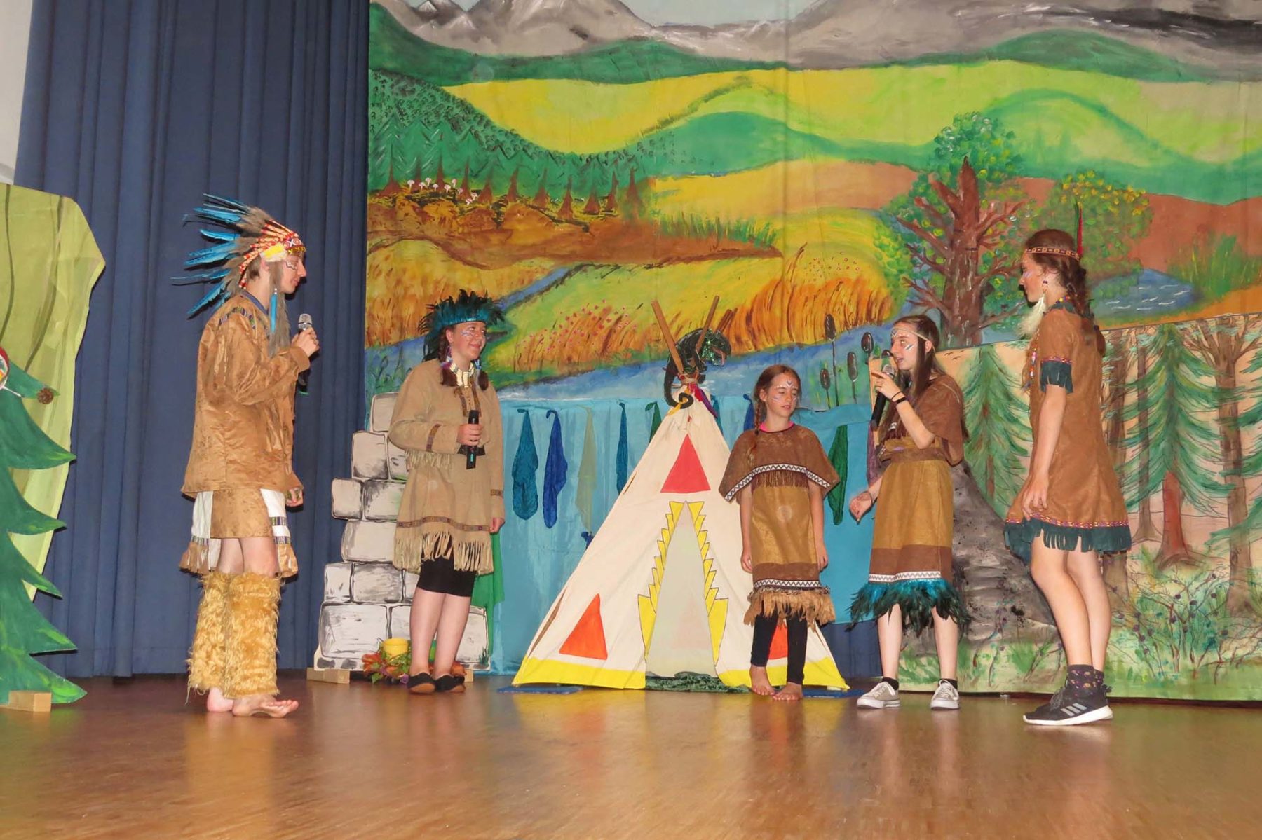 Die Altersgruppe der 10- bis 14-jährigen Kinder zeigte das Stück »Chaos im Indianerdorf«. Mit Indianergeheul stürmen die Akteure die Bühne und zeigen erstmal einen Indianertanz. Der Indianerhäuptling ist immer unzufrieden. Er hat »nur zwei Töchter« und hätte lieber einen Sohn gehabt: »Mädchen sind zu nichts zu gebrauchen. Ich will auf Bärenjagd gehen – doch mit wem?«, ärgert sich der Häuptling. Einige Indianerkinder gehen in den Wald zum Beeren sammeln. Daraus mixen sie einen Zaubertrank, den die Töchter des Häuptlings mitnehmen, um damit wilde Pferde zu zähmen. Zwei Pferde bringen sie mit als Geschenk für ihren Vater, doch dem sind die Pferde zu klein. Daraufhin bekommt er Ärger mit seiner Frau. Inzwischen sind die beiden Bären ebenfalls im Wald unterwegs und sammeln Honig. Davon erfährt auch der Häuptling und bekommt Appetit auf Honigbrot. Seine Tochter Rivana hat von den Bären und den Bienen gehört, geht ebenfalls dahin und besänftigt die Bienen mit guten Worten. Sie geben ihr daraufhin Honig, den Rivana zu ihrem Vater, dem Häuptling, bringt. Doch der will sie auch dafür nicht loben, trotz Aufforderung von seiner Frau und Großmutter. Da muss die Tochter erst von den Katzen und Wölfen entführt werden, damit er erkennt, dass sie in Gefahr ist und ihm fehlt. Er kämpft mit den Tieren und kann Rivana zurückerobern: Chaos im Indianerdorf. Der Häuptling ändert endlich seine Meinung und sagt: »Meine Tochter Rivana war mutig und wenn der Stamm einen neuen Häuptling braucht, wird es vielleicht eine Frau, eine ›Häuptline‹.« Über diesen Sinneswandel freuen sich alle und tanzen miteinander einen Indianertanz.