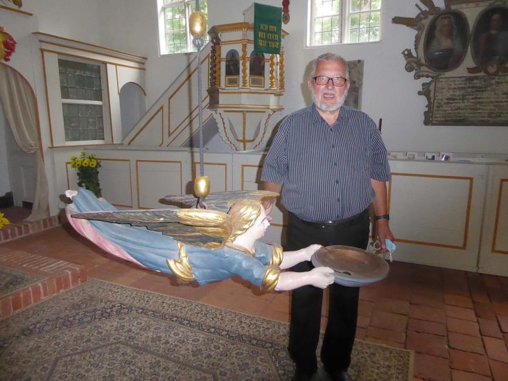 In der Dorfkirche Scharteucke hängt ein Taufengel. Früher wurden die Figuren zur Taufe von der Decke heruntergelassen, um den Menschen mit allen Sinnen erfahrbar zu machen, was eigentlich geschieht. Heute glauben wir mit virtuellen Bildern auf dem Handy mit allen Sinnen die Welt zu erfahren, aber das ist ein Irrtum. Die Bilder auf dem Handy sind zweidimensional, wie ein Schatten, aber nicht greifbar. Informierend und unterhaltsam, aber nicht mehr. Sie erreichen nur einen ganz kleinen Bereich unseres Seins. Es lohnt sich, die Welt wieder mit allen Sinnen zu erfassen: beim Wandern im Wald, beim Betreten einer Kirche, bei einer Rast auf dem belebten Marktplatz oder bei der staunenden Besichtigung einer Dorfkirche.