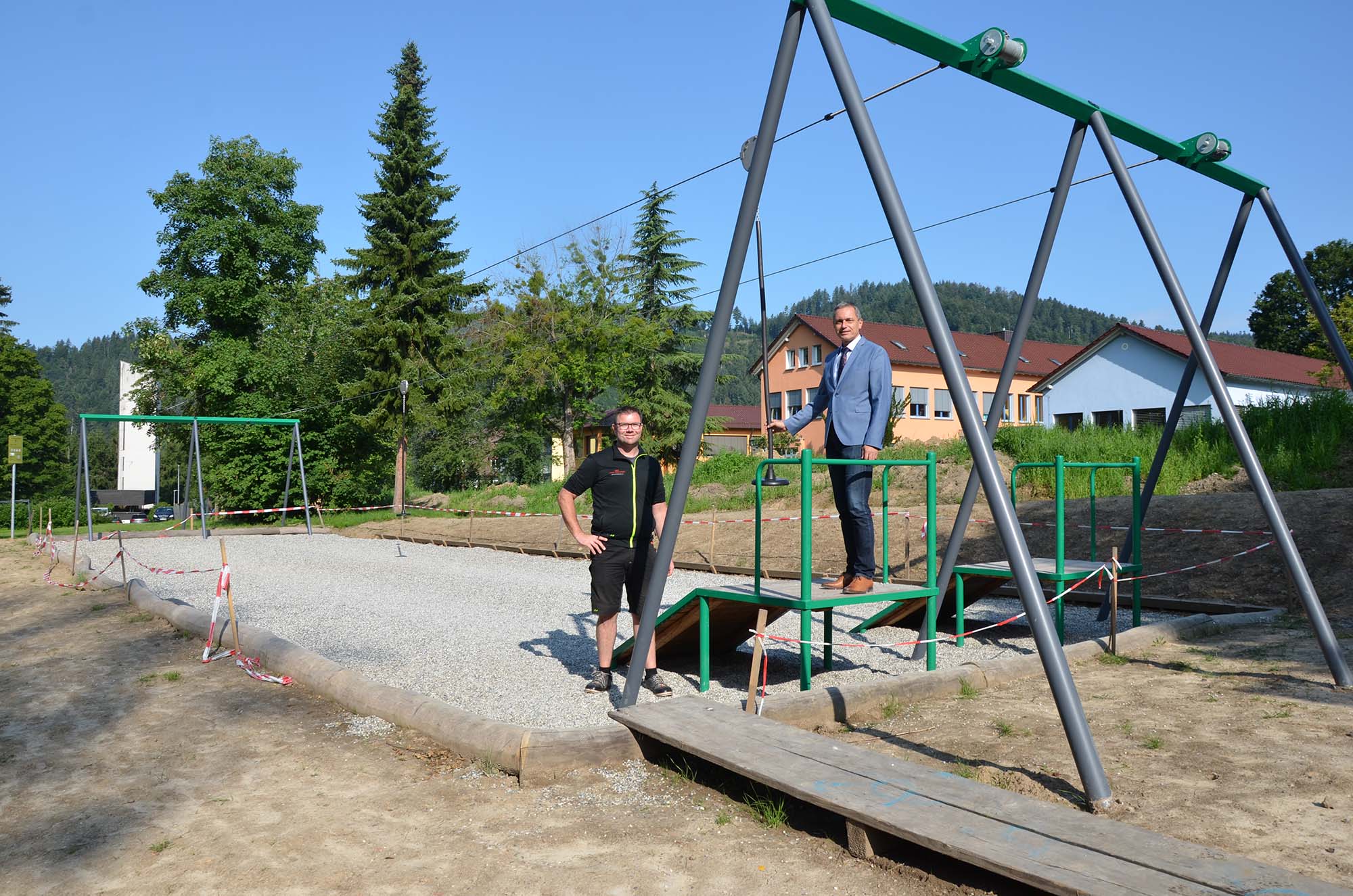 Auf die Bügel sitzen, starten, schwingen und lossausen: Mit einer 25 Meter langen Doppel seilbahn hat der Spielplatz beim Stadtpark ein neues Highlight für kleinere und auch große Kinder. Anfang Juli erfolgte die TÜV-Abnahme der Seilbahn, die bestätigte, dass die Anlage den Vorschriften entspricht und ein sicheres Spielen möglich ist.