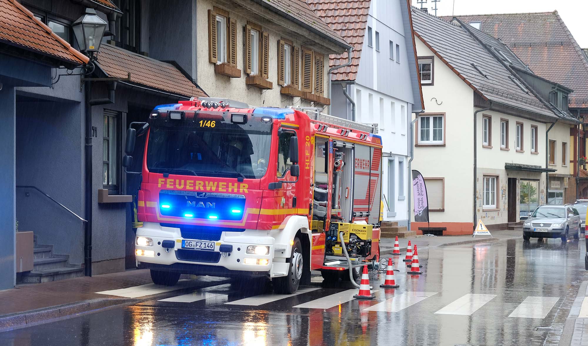 In Zell war die Feuerwehr gestern an fünf Einsatzstellen entlang der Hauptstraße gefordert. Sie wurde gerufen, weil Wasser durch die Schächte in die Keller drückte. Insgesamt waren 35 Feuerwehrleute aus allen drei Zeller Abteilungen im Einsatz. Unterstützt wurden sie im Rahmen der Führungsunterstützung und Beratung von zwei Helfern des THW.