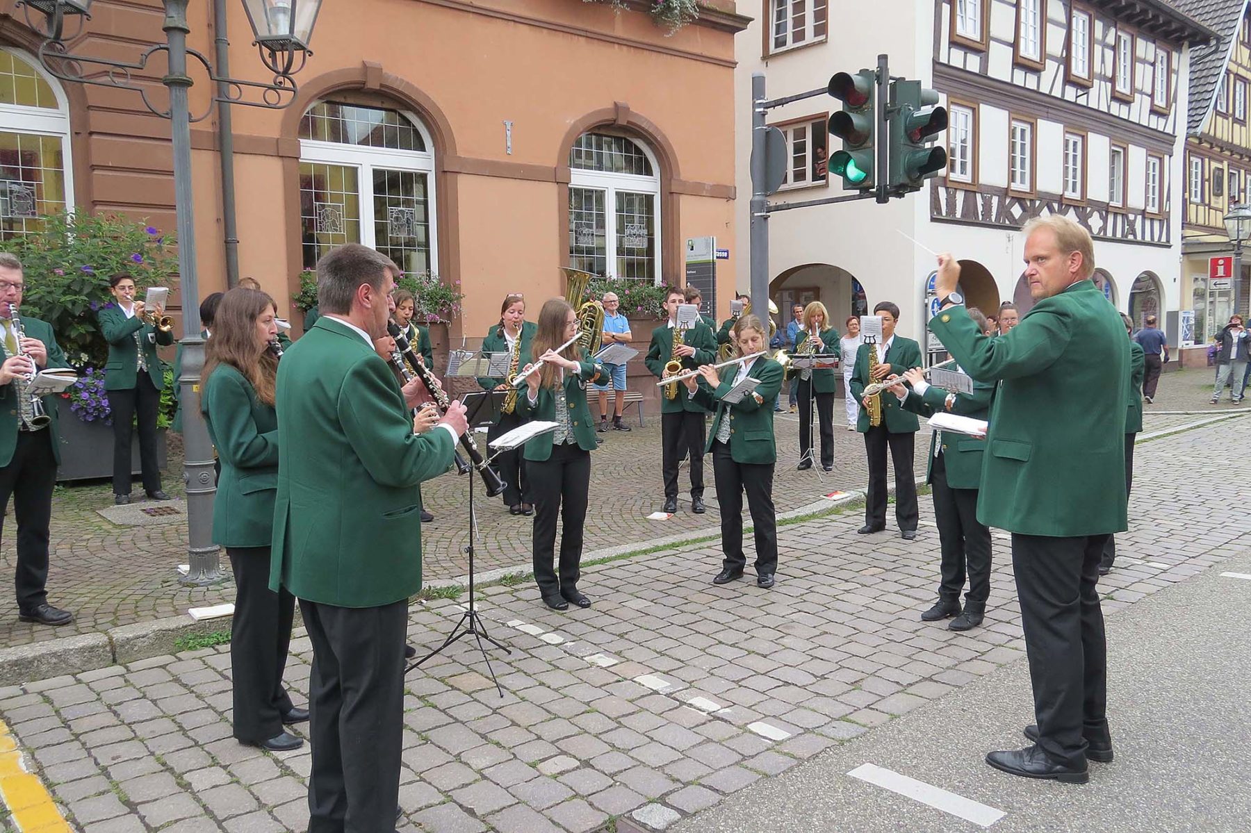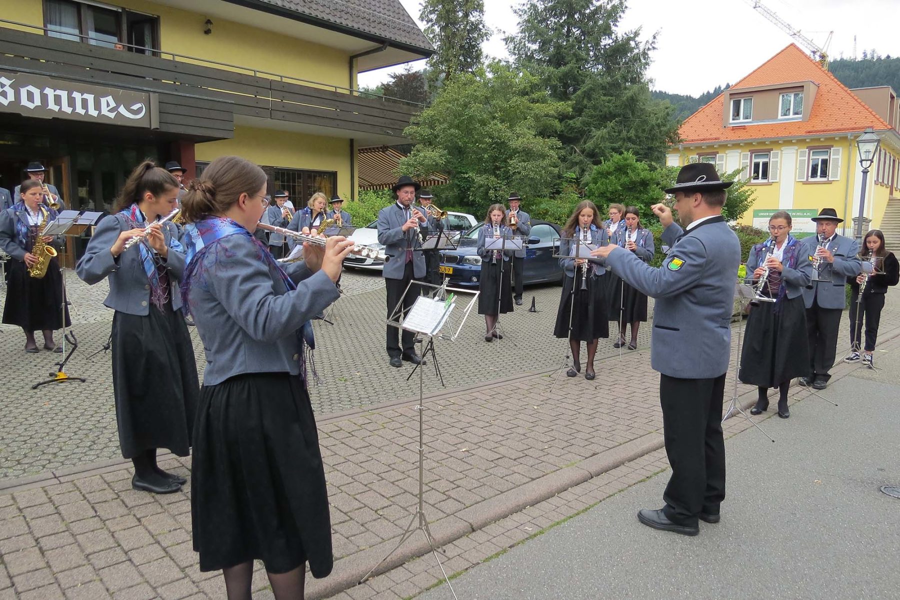 Die Stadtkapelle hatte vor dem Rathaus Aufstellung genommen und begrüßte musikalisch die Prozessionsteilnehmer, sobald sie in der Kirchstraße sichtbar waren. Die Prozession machte Halt und hörte der Musik zu. Danach erfolgte ein Kirchenlied, dass von der Kapelle musiziert und der Gemeinde gesungen wurde. Dann spielte die Kapelle nochmals ein Lied, während die Prozession langsam die Hauptstraße weiterging. Bei der Abzweigung zur Grabenstraße spielte bereits die Musikkapelle Unterharmersbach, die im Hirschgarten Aufstellung genommen hatte. Auch hier gab es denselben Ablauf mit zwei Liedern zum Zuhören und einem Kirchenlied zum Mitsingen.
