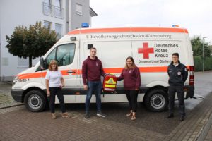 Bei der Übergabe des Erste-Hilfe-Rucksacks (von links): Elvira Schilli (1. DRK-Vorsitzende), Jannik Schnurr (stellvertretende Leitung KJG), Anne Selinger (Leitung KJG) und Julian Schilli (DRK).