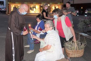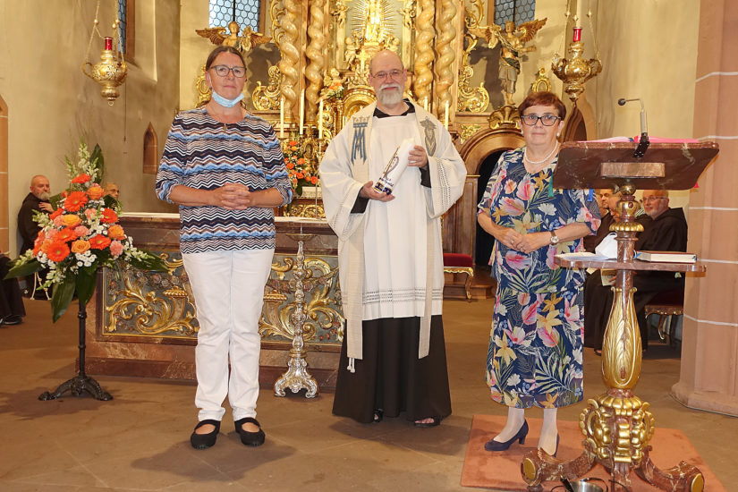Eine lange Reihe von Kapuzinern auch aus benachbarten Klöstern zog zu Beginn der Andacht mit der Lichterprozession bei festlicher Orgelmusik in die gut besuchte Kirche ein. Guardian Bruder Markus begrüßte alle herzlich und freute sich, dass nun das Hochfest Mariä Himmelfahrt wieder weitgehend stattfinden könne wie von alters her. Nach altem Brauch überreichten Brigitte Metzler und Cäcilia Schnaiter vom Gemeindeteam Zell Bruder Markus eine Votivkerze der Zeller Pfarrgemeinde. In seiner Predigt betonte Bruder Markus, dass die Aufnahme Mariens in den Himmel, ein österliches Fest sei. Auch hier gehe es wie an Ostern um Auferstehung und ewiges Leben und damit auch eine Aussicht auf das, was die für sich erwarten, nämlich in den Himmel zu kommen. Dies meint das Hochfest der Aufnahme Maria mit Leib und Seele. Einzigartig für Maria und beispielhaft für alle mit unserem ganzen Leben.