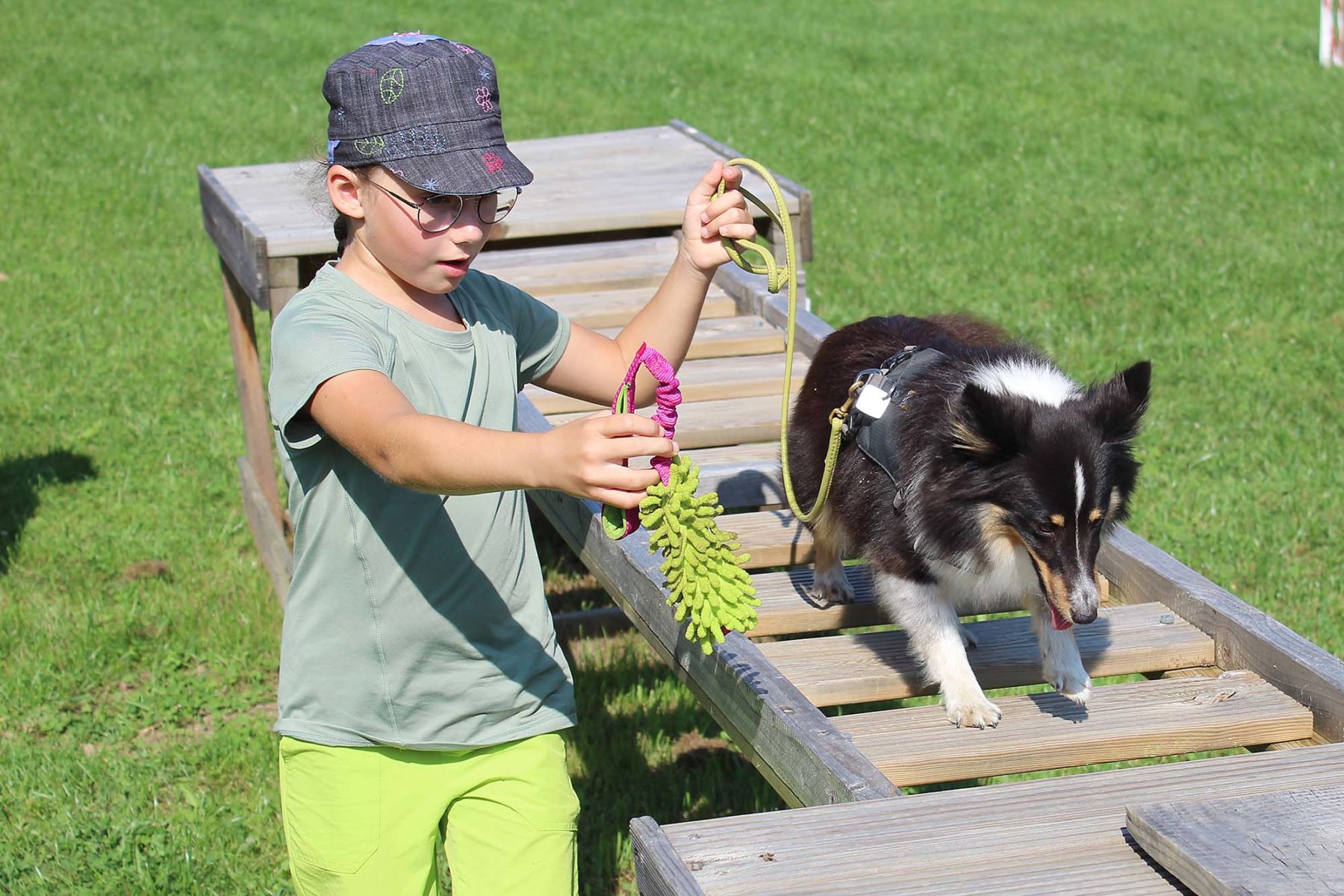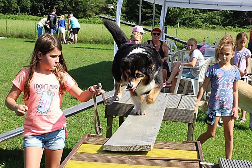 Auch echte Teamarbeit von Mensch und Hund war gefragt und wurde geübt. Durch den dunklen Tunnel laufen, über einen wackligen Steg balancieren oder Schritt für Schritt über eine Leiter gehen oder ganz und gar mutig durch verschiedene Bänder den Weg zu finden, waren ein Teil der Aufgaben, die die Hunde und Kinder bewältigen mussten. Das Fachwissen zum Thema Hund wurde mit einem Rätsel überprüft und erweitert. So wurden Bilder von Hunden im Einsatz zu ihren entsprechenden »Hundeberufen« wie Rettungs-, Wach-, Dienst-, Jagd- und Assistenzhund sortiert. Eine Trinkpause für die zwei- und vierbeinigen kleinen Freunde gab es natürlich auch, die mit Gebell und Beifall klatschen sehr schön »Danke« sagten.