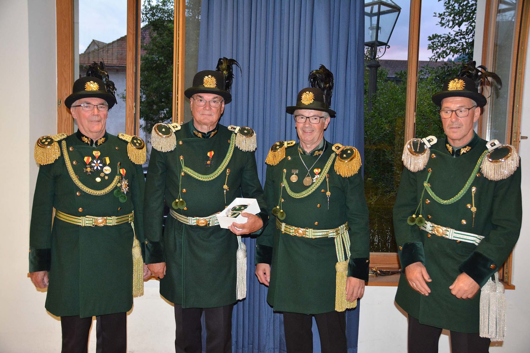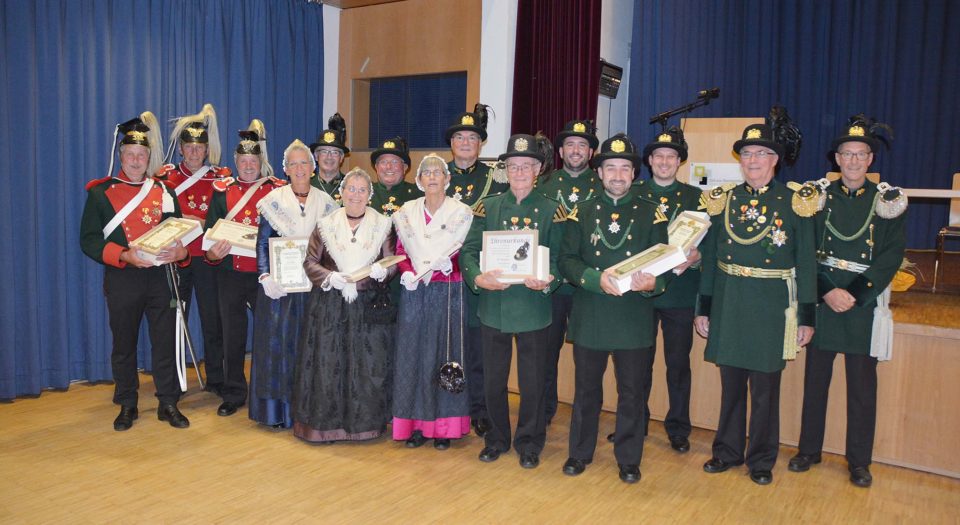 Die Vereinsjubilare der freiwilligen Bürgerwehr der Jahre 2020 und 2021 konnte im Rahmen der Generalversammlung geehrt werden. Bürgermeister Günter Pfundstein hatte genau nachgerechnet: »Es sind insgesamt 536 Jahre – eine unglaubliche Zahl!« Er dankte allen Aktiven, dass sie das Brauchtum leben und die lange Tradition fortsetzen.