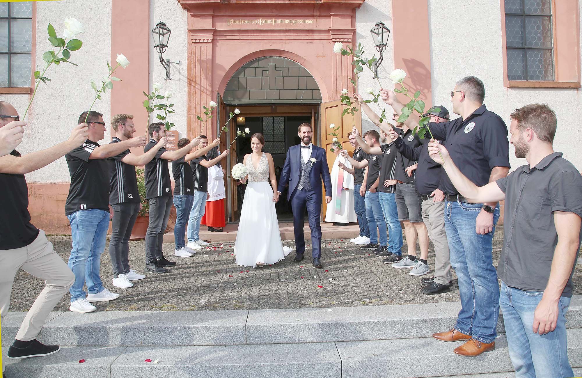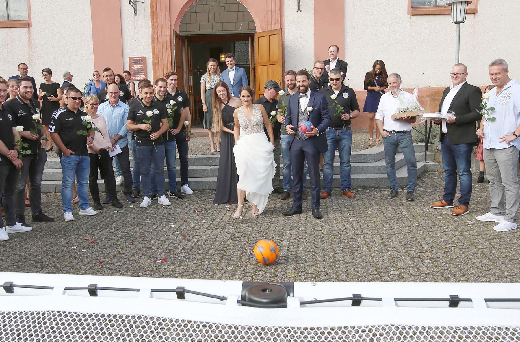 Groß war die Schar der Gratulanten, die sich auf dem Kirchplatz versammelt hatten. Die Spieler des SV Oberharmersbach standen Spalier, um ihrem aktiven Mannschaftskameraden und Vorstandsmitglied Matthias Stunder zu gratulieren. Janina Stunder musste zuvor ihre Treffsicherheit unter Beweis stellen, was ihr wohl wegen des nicht unbedingt geeigneten Schuhwerks auch mit dem zweiten Torschuss gelang. Vorsitzender Sebastian Schneider sowie seine Vorstandskollegen Thomas Pfundstein und Günther Roth überreichten stellvertretend für den ganzen Verein mit einem Präsent die Wünsche für den gemeinsamen Lebensweg.