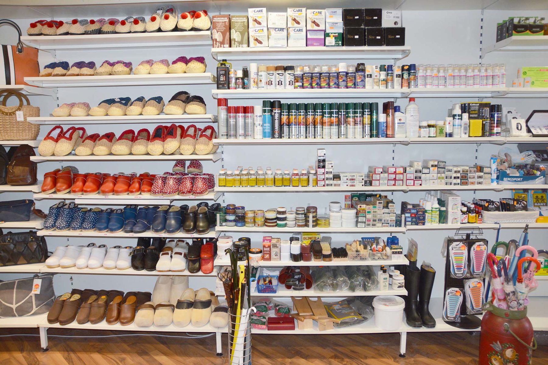 Die Reparatur von Tanzschuhen oder die Instandsetzung von Schnittschutzschuhen für Waldarbeiter verlangen das besondere Können des Schuhmachers. Ebenso werden orthopädische Reparaturen und Umarbeitungen von Schuhen ausgeführt. Ergänzend zum Schuhservice findet die Kundschaft im Ladengeschäft eine große Zubehörauswahl. Schuhpflegeartikel oder Schuheinlagen werden ebenfalls angeboten.