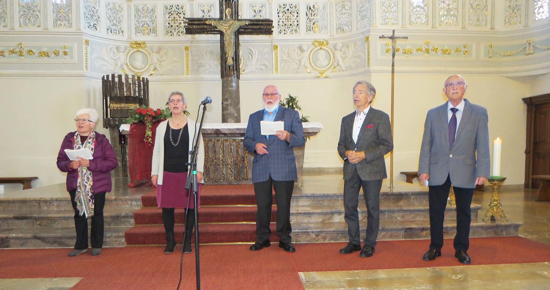 Der katholische Kirchenchor unter Leitung von Wolf­ram Dreher sang zu Beginn der Feier den Kanon »Gaudeamus hodie« – wir freuen uns heute. Dabei wird die prägnante Melodie als Thema durch alle vier Stimmen geführt. Welch fröhlicher und gleichzeitiger feierlicher Gesang von der Orgelempore!
