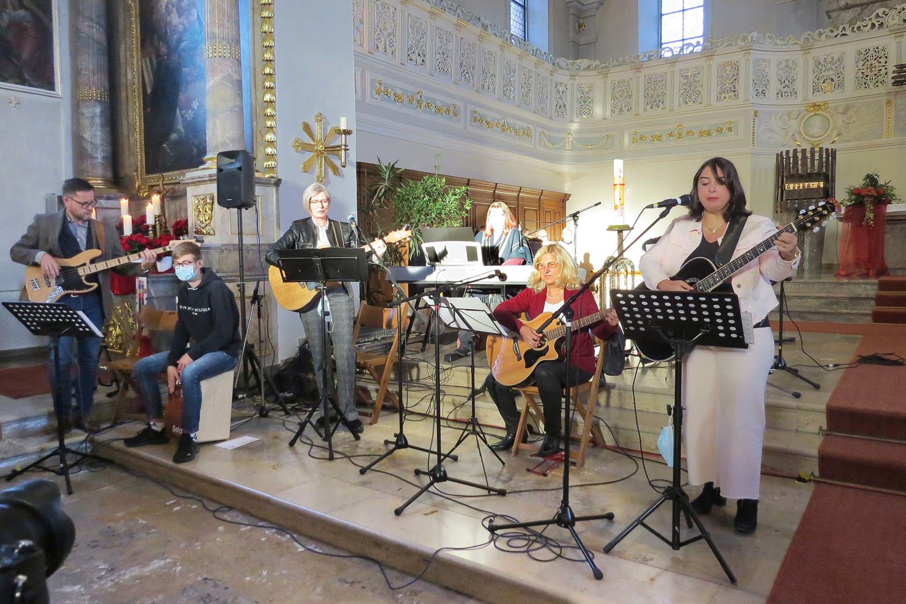 Musikalisch wurde die Feier von der Lobpreisband mitgestaltet. Die sieben Musiker verstanden es, mit ihren Stimmen und Instrumenten modernen Klang in die Kirche zu bringen. Bei dem Kirchenlied »Du kannst nicht tiefer fallen als in Gottes Hand« kam die Sopranstimme von Bianca Monninger perfekt zur Geltung.