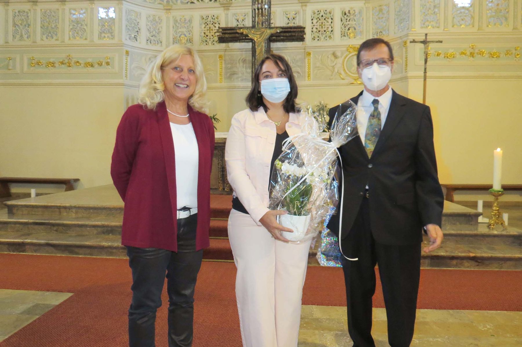 Ingrid Mattheis (links) von der Lobpreisband überreichte einen Gutschein und Blumen. Sie berichtete, dass Pfarrer Monninger für die Technik der Band verantwortlich ist: »Ohne dich wären wir technisch verloren«, erklärte sie schmunzelnd. Außerdem spielt Pfarrer Monninger Gitarre und singt.