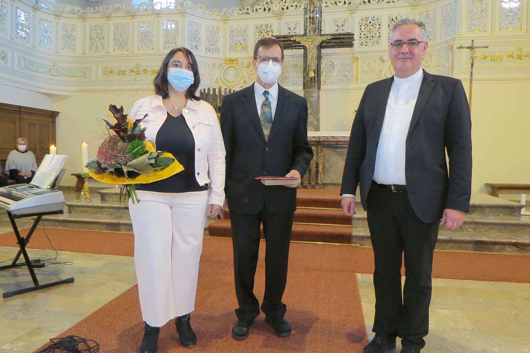 Dekan Frank Wellhörner hielt eine persönlich gestaltete Rede mit vielen Lobesworten für Pfarrer Reinhard Monninger. Er nannte die Stationen seiner beruflichen Laufbahn und betonte, dass Monninger in allen Gemeinden und Diensten viel aufgebaut und wertvolle Spuren hinterlassen habe. Vor allen den geplanten Neubau des Gemeindehauses in Zell habe er mit viel Energie vorangetrieben. Die Corona-Zeit habe ihm viel abverlangt. Die Frage, wie das Kirchenleben in dieser Zeit gestaltet werden könne, habe ihn umgetrieben. Mit viel Zuversicht im Glauben und der Unterstützung seiner Frau Bianca und den Kindern habe er die Zeit überstanden. Seine Frau Bianca habe auch eigene Ideen in die Gemeindearbeit eingebracht und mit der Lobpreisband kirchenmusikalisches Neuland betreten. »Deine Kontakte zu den Mitarbeitern und Kollegen waren von Liebe und Güte geprägt«, betonte Wellhörner. Monninger hinterlasse ein gut bestelltes Haus. Im Namen der Ortenauer Kirchenrates, des De­kanats Offenburg und der Landeskirche Baden bedankte er sich für die geleistete Arbeit, besonders für die elf Jahre in der Zeller Kirchengemeinde. Danach bat er Bianca und Reinhard Monninger in den Altarraum und sprach den Segen über beide aus. Er las die Entlassungsurkunde der Landeskirche vor und überreichte sie an Monninger: »Du bist jetzt im Ruhestand.«