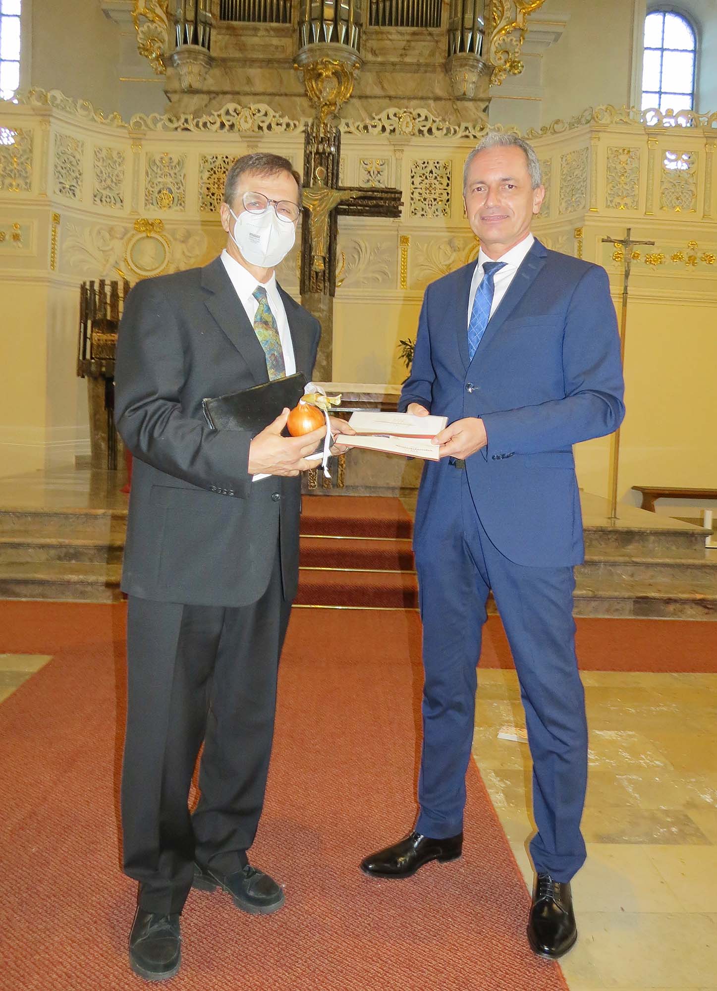 Bürgermeister Günter Pfundstein sprach im Namen der Bürgermeister und Ortsvorsteher der Nachbargemeinden Oberharmersbach, Biberach und Nordrach. »Herr Monninger, die Zusammenarbeit zwischen der Kirche und der Stadt war stets vertrauensvoll und von Respekt geprägt«, sagte Pfundstein anerkennend. Die gemeinsamen sechs Jahre mit ihm als Bürgermeister waren geprägt von einer guten Zusammenarbeit. »Sie verstehen es, die Gefühle von Menschen zu berühren, sie sind im wahrsten Sinne ein Seelsorger«, berichtete er von seinen Erfahrungen mit Monninger. Darum sei die Corona-Zeit mit fehlenden menschlichen Kontakten für Monninger auch schwierig gewesen. Pfundstein ver­sicherte Monninger, dass er auch im Ruhestand als Mensch und Pfarrer gebraucht werde. Abschließend erklärte er: »Ich wünsche Ihnen das Beste und Ihrer Familie eine glückliche Zeit, vor allen Dingen Gesundheit.« Er überreichte einen Gutschein für ein gemeinsames Essen mit einer Zwiebel als Symbol.