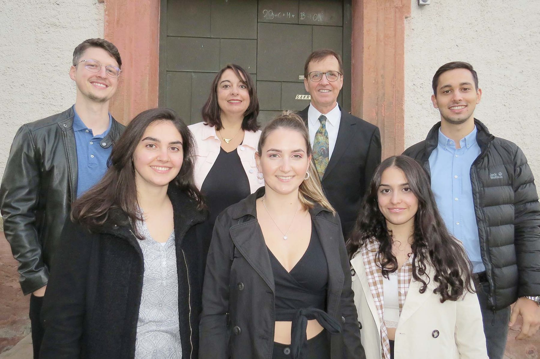 Die fünf erwachsenen Kinder der Familie Monninger waren zur Verabschiedung des Vaters gekommen. Von links im Bogen nach rechts: Simeon, Miriam, Susanne, Tabea und Thomas Monninger. Darüber freuen sich natürlich Bianca und Reinhard Monninger (hinten Mitte).