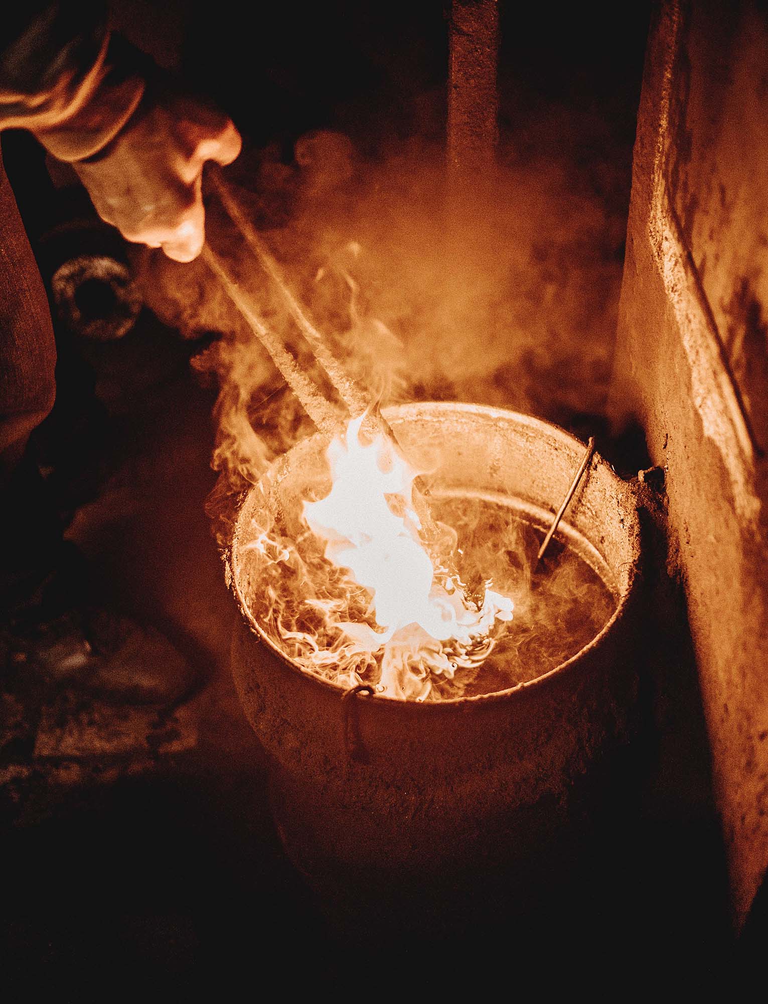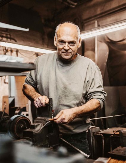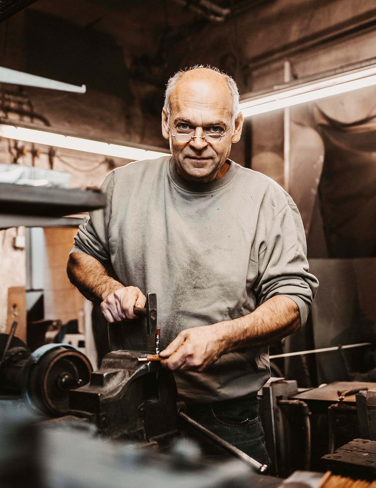 Die alte Esse steht noch immer in der Ecke der Werkstatt, doch wird sie heutzutage seltener benutzt. Denn: Seit der Nachkriegszeit kommen Klingen-Rohlinge zum Einsatz, die in industriellen Gesenkschmieden in Formen hergestellt werden. »Die verarbeiten wir dann weiter«.