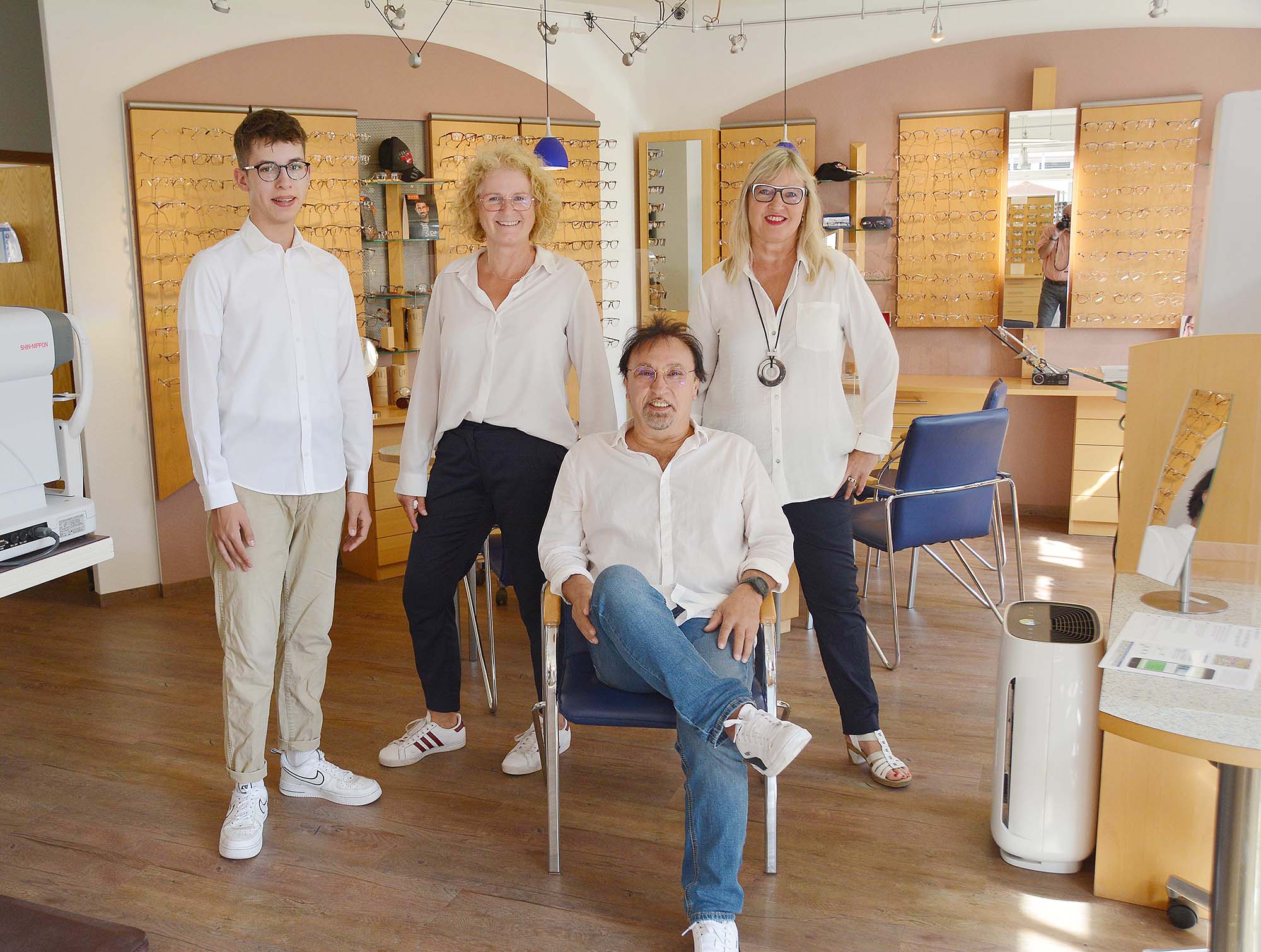 Das Zeller Fachgeschäft Optik-Glaser wurde bei der unabhängigen DtGV-Prüfung als »Herausragender Optiker 2021« ausgezeichnet. Darüber freuen sich (von rechts) Augenoptikerin Petra Glaser, Augenoptikerin Andrea Neumaier, Auszubildender René Stubert und Augenoptikermeister Erdogan Yilmaz (vorne sitzenden). Foto: Hanspeter Schwendemann