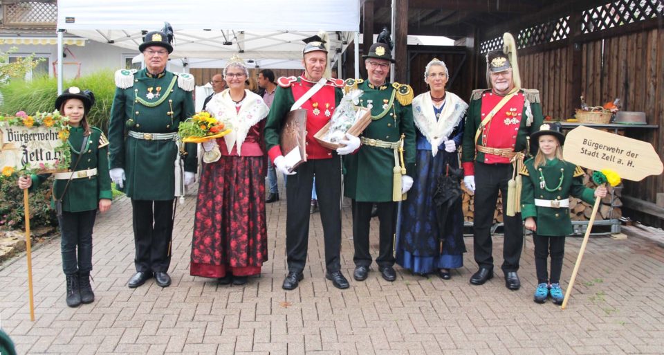Schon 38 Jahre kommt Willi Schwarz vier bis sechs Mal nach Zell und wünschte sich jetzt, dass die Zeller einmal zu ihm nach Bräunlingen kommen. So wurde ein Bus organisiert und ein Festsonntag gefeiert. Zuerst wurde Willi, dank seinem Einsatz für die Zeller Bürgerwehr, der große Adler überreicht und ein Salut geschossen. Seine Frau Dagmar, die ihn als Trachtenträgerin immer begleitet, bekam einen Blumenstrauß. Nach einem kleinen Aufmarsch durch Bräunlingen wurde die Bürgerwehr von Willi zum Mittagessen und Kaffee eingeladen.