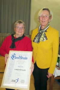 Die Vorsitzende Sybille Nock erklärte zur Person von Lilo Fix: Sie ist als fünfjähriges Kind in das Turnen gekommen. In wenigen Wochen ist sie seit 65 Jahren Mitglied des Turnvereins. 1972 hat sie die erste Auszeichnung in Bronze erhalten, danach folgten Silber und Gold, ebenso vom Turngau Ortenau.