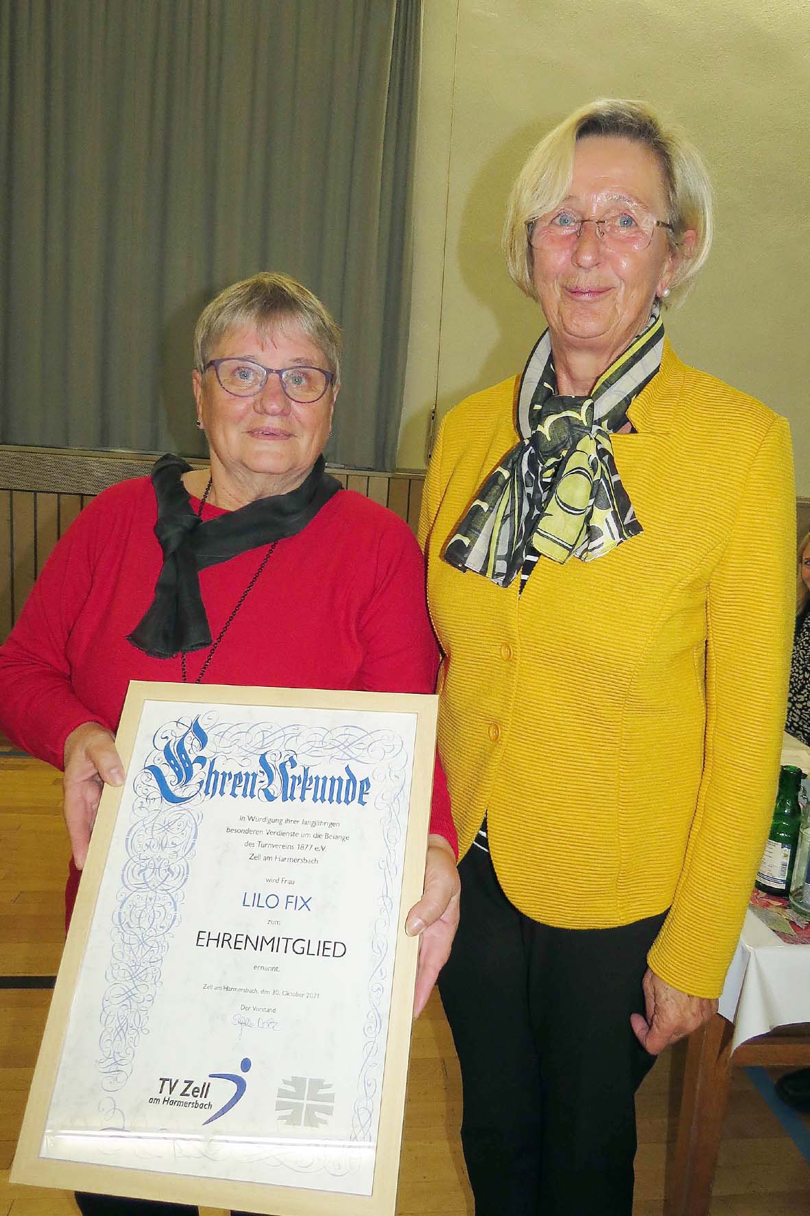 Ab 1969 engagierte sich Lilo Fix als Schülerturnwartin, Turnwartin und Übungsleiterin; seit 36 Jahren trainiert sie die Frauengruppe am Donnerstag. Mit großem Weitblick hat sie die Gruppe Eltern-Kind-Turnen etabliert, die auch heute noch ein Erfolgsmodell des Turnvereins ist. Im Jahr 2019 wurde sie von der Stadt Zell für das außergewöhnliche Engagement von 50 Jahren als Übungsleiterin geehrt. Seit Jahrzehnten ist sie außerdem in der Vorstandschaft aktiv.