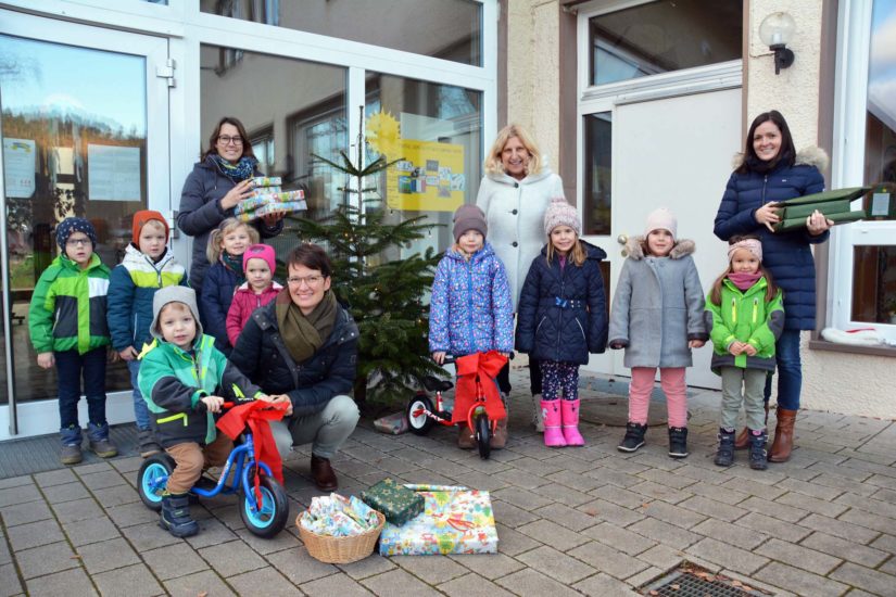 Bereits am Freitag gab es strahlende Augen bei den Kindergartenkindern, als die Elternvertreterinnen viele schön verpackte Geschenke ablieferten. Was sich darin verbirgt, wird natürlich noch nicht verraten. Nur der kleine Oskar durfte schon mal auf einem Laufrad Platz nehmen. Ansonsten dürfen sich alle Kinder des »Sternschnuppen«-Kindergarten und mit ihnen die Erzieherinnen und Kindergartenleiterin Ingrid Mattheiß auf viele schöne Spielsachen freuen. Diese erweitern dann den Fundus in den einzelnen Gruppen.