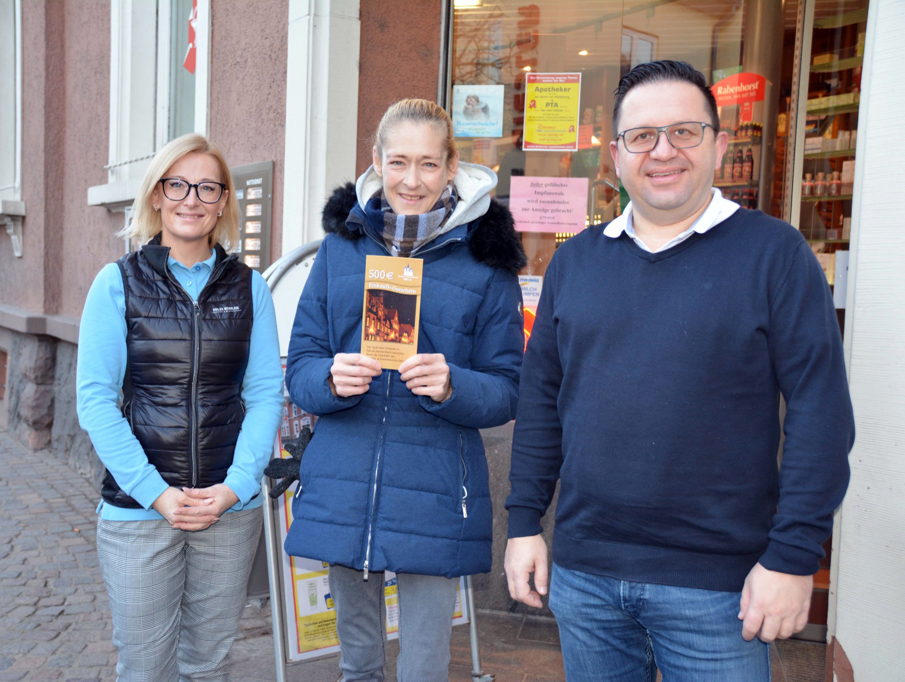 Ein zusätzliches Weihnachtsgeschenk durfte Linda Rösener (Mitte) in Empfang nehmen. Sie hat beim Weihnachtsgewinnspiel des Handels- und Gewerbevereins den Hauptpreis in Höhe von 500 Euro gewonnen.