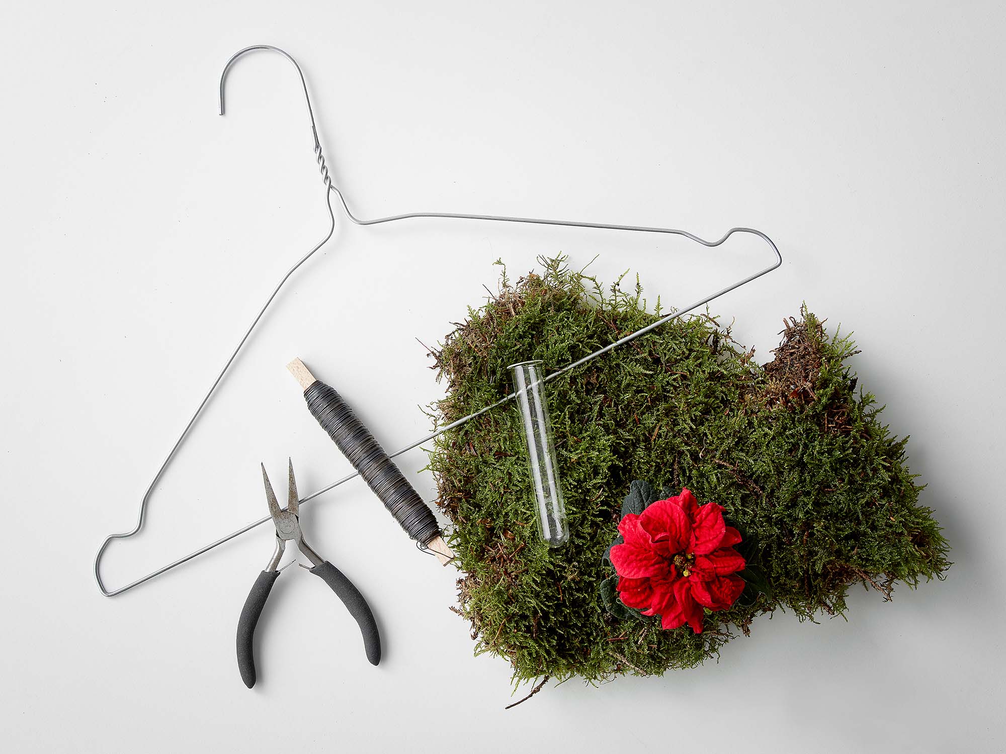 Alles, was man außer dem Kleiderbügel noch braucht, sind Moos, Basteldraht, eine Schnittblume, zum Beispiel ein geschnittener Weihnachtsstern, ein Blumenröhrchen oder ein Reagenzglas und eine Zange.