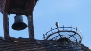 Auf dem Rathaus, der Alten Kanzlei und auch auf der Wallfahrtskirche (oben) haben sie sich schon auf ihren Nestern niedergelassen. Das Nest auf dem Storchenturm ist noch nicht besetzt. Der Drahtkorb wurde vom Betriebshof gereinigt, so dass sich die künftigen Mieter dort wieder ein neues Nest einrichten können. Für den kleinen Turmfalken ist die Nisthilfe wohl nicht geeignet.