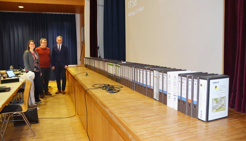 Nicht nur vor Ort in Unterharmersbach, auch auf dem Rechnungsamt und dem Bauamt der Stadt Zell hat das Bauprojekt deutliche Spuren hinterlassen. Bei der Gemeinderatssitzung am Montag konnte Bürgermeister Günter Pfundstein gemeinsam mit Rechnungsamtsleiter Thomas Seeger und Mitarbeiterin Birgit Maier über 70 Aktenordner präsentieren, die den Umfang der Bauarbeiten dokumentieren.