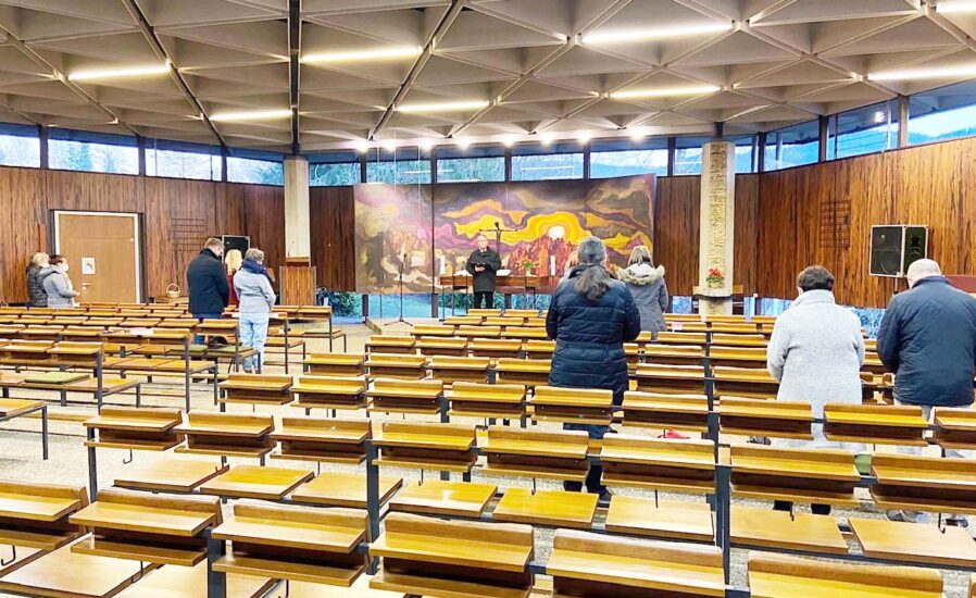 In intensiven Gebeten wurde das Entsetzen, die Ohnmacht und die Fassungslosigkeit über die kriegerische Gewalt zum Ausdruck gebracht. Die anschließende Lesung aus der Bergpredigt sprach denen Mut zu, die Leid tragen, nach Gerechtigkeit dürsten und deshalb verfolgt werden. In den Fürbitten wurde um Schutz und Hilfe für die Flüchtenden, Friedfertigkeit und Versöhnungswillen für die Mächtigen und um Erkenntnis was wir selbst zum Frieden beitragen können, gebeten. Mit einem Vaterunser und der Segensbitte endete dieser Friedensgottesdienst.